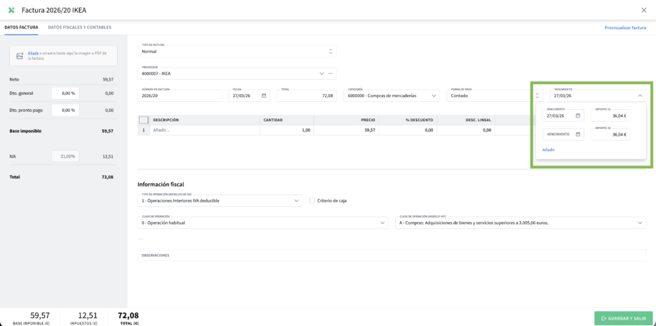 Accede a la factura desde Compras o Ventas, según corresponda, y ajusta sus vencimientos.