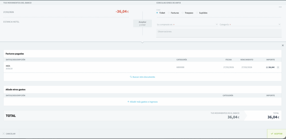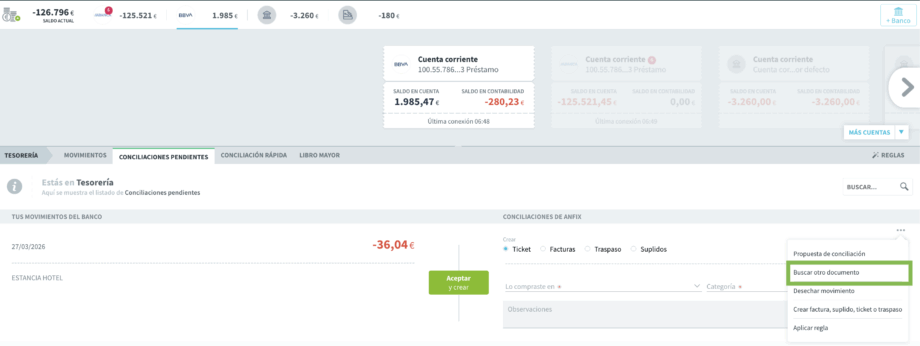 Ve a Negocio → Tesorería → Conciliaciones pendientes, localiza el movimiento bancario y pulsa en Buscar otro documento.