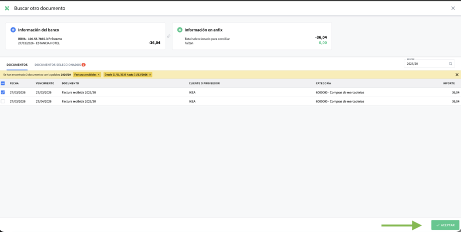 Debajo del movimiento verás los datos del vencimiento seleccionado. Revísalos y pulsa en Aceptar para finalizar la conciliación.