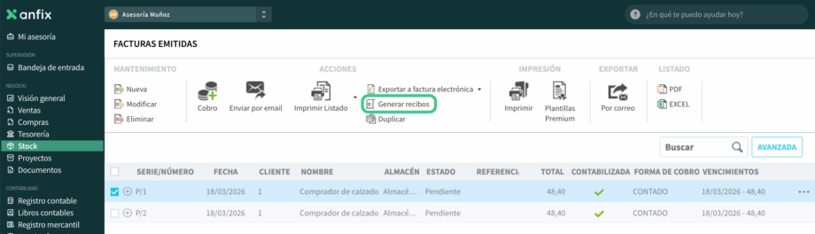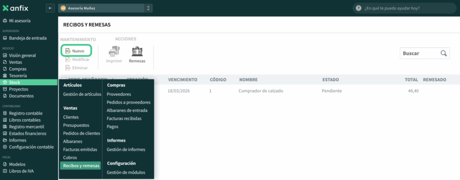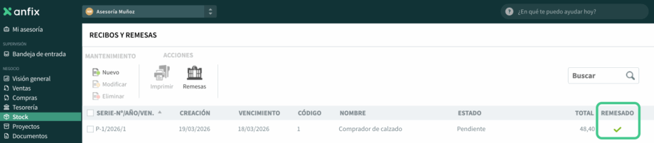 Una vez creados, los recibos aparecerán en Stock → Recibos y remesas. Desde ahí podrás modificarlos, eliminarlos o imprimirlos.