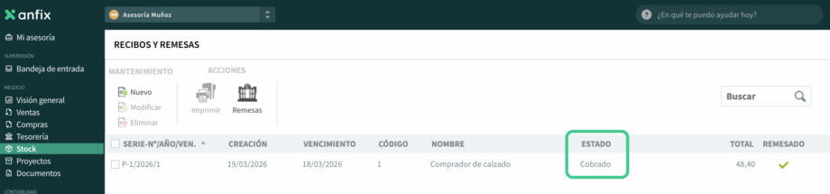 En el listado de Recibos y remesas, el recibo aparecerá con estado Cobrado.