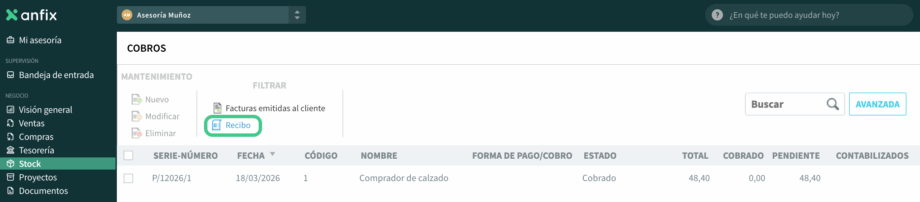 Si has generado un recibo desde una factura pero no vas a incluirlo en una remesa, el cobro se crea desde Stock → Cobros.