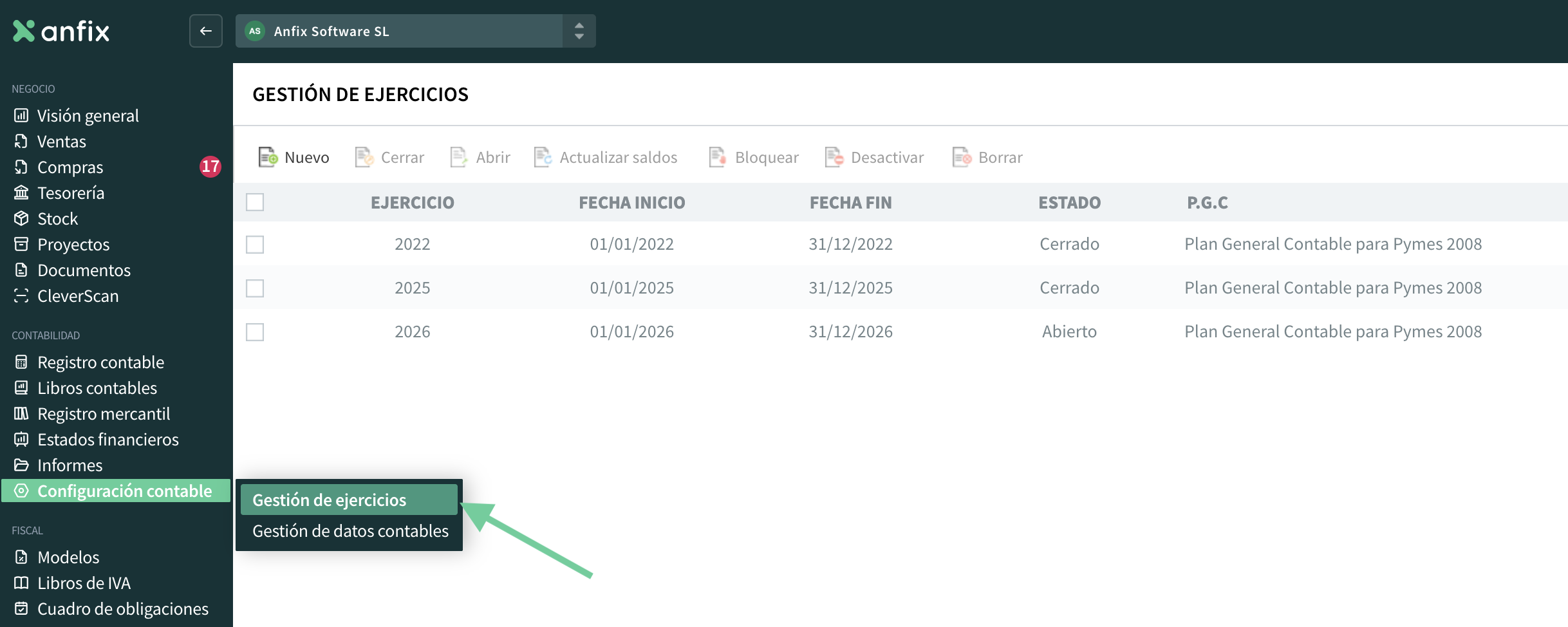 Para poder trabajar en Anfix, necesitas tener al menos un ejercicio contable abierto. Puedes comprobar el estado de tus ejercicios y crear uno nuevo desde la gestión de ejercicios.