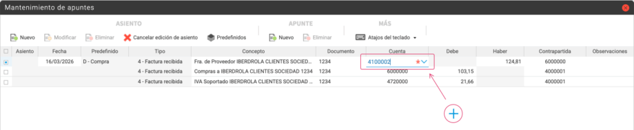 Pulsa F6 para cambiar entre el asiento y el detalle de la factura.