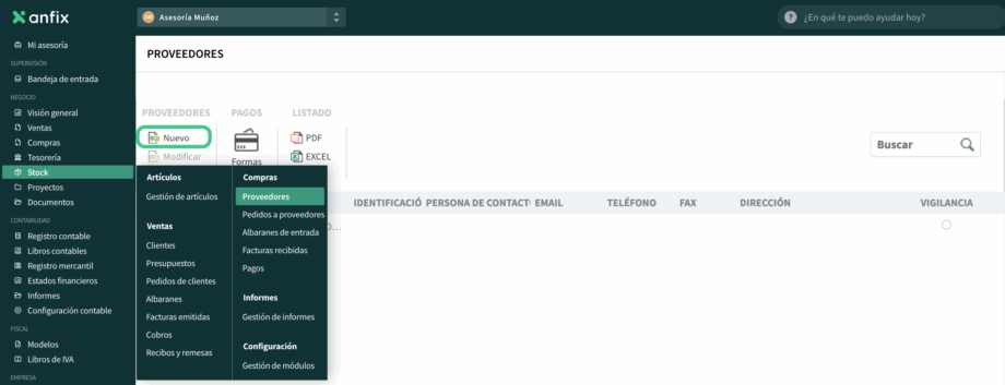 Desde este apartado podremos completar esos proveedores, o bien crearlos, pulsando en «Nuevo»