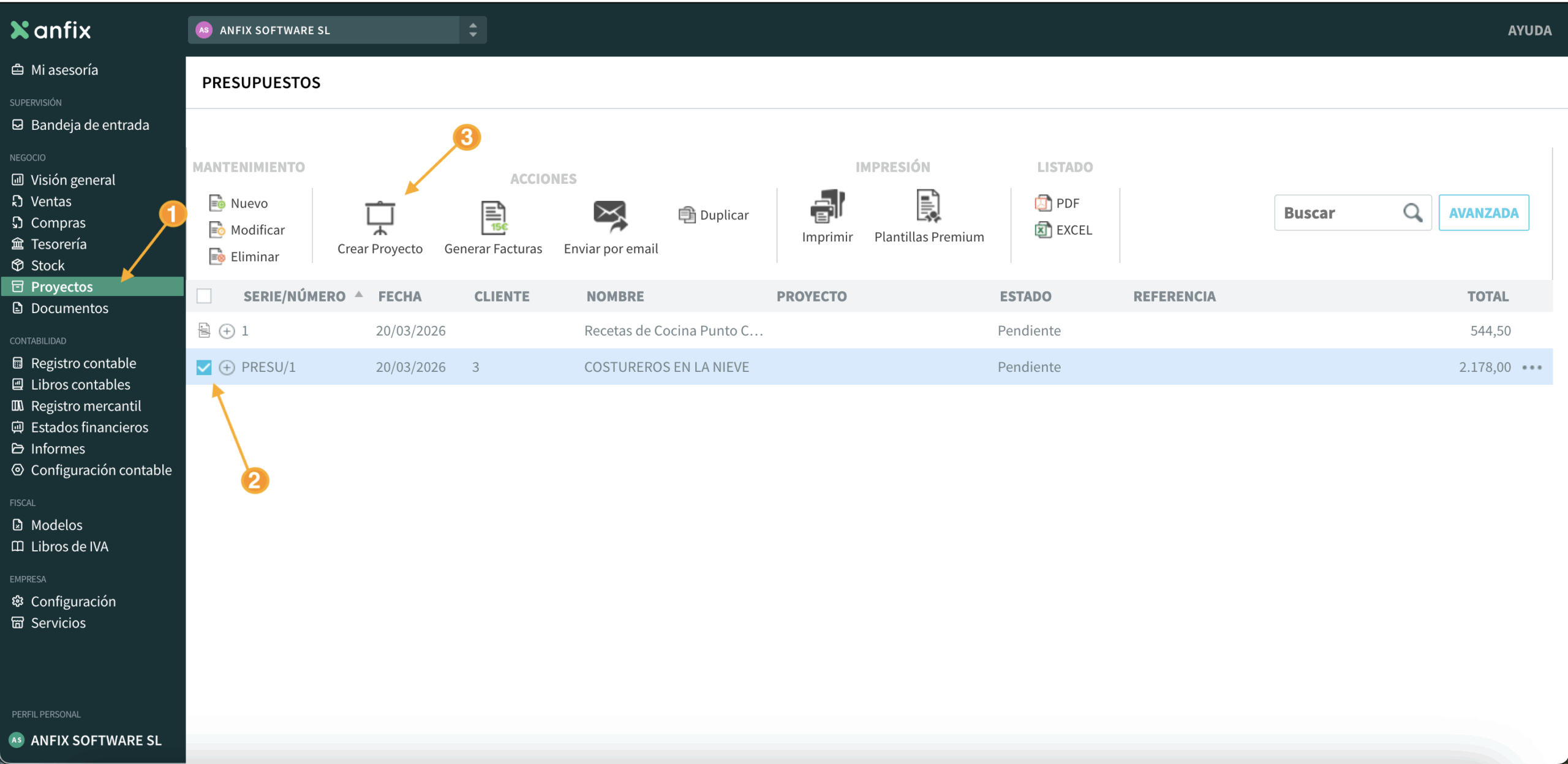 También puedes generar un proyecto a partir de un presupuesto existente creado desde proyectos. Para hacerlo debemos seguir los siguientes pasos: