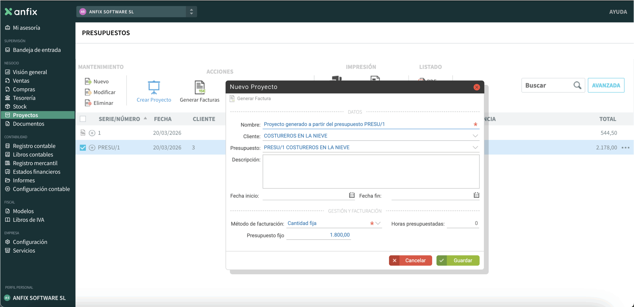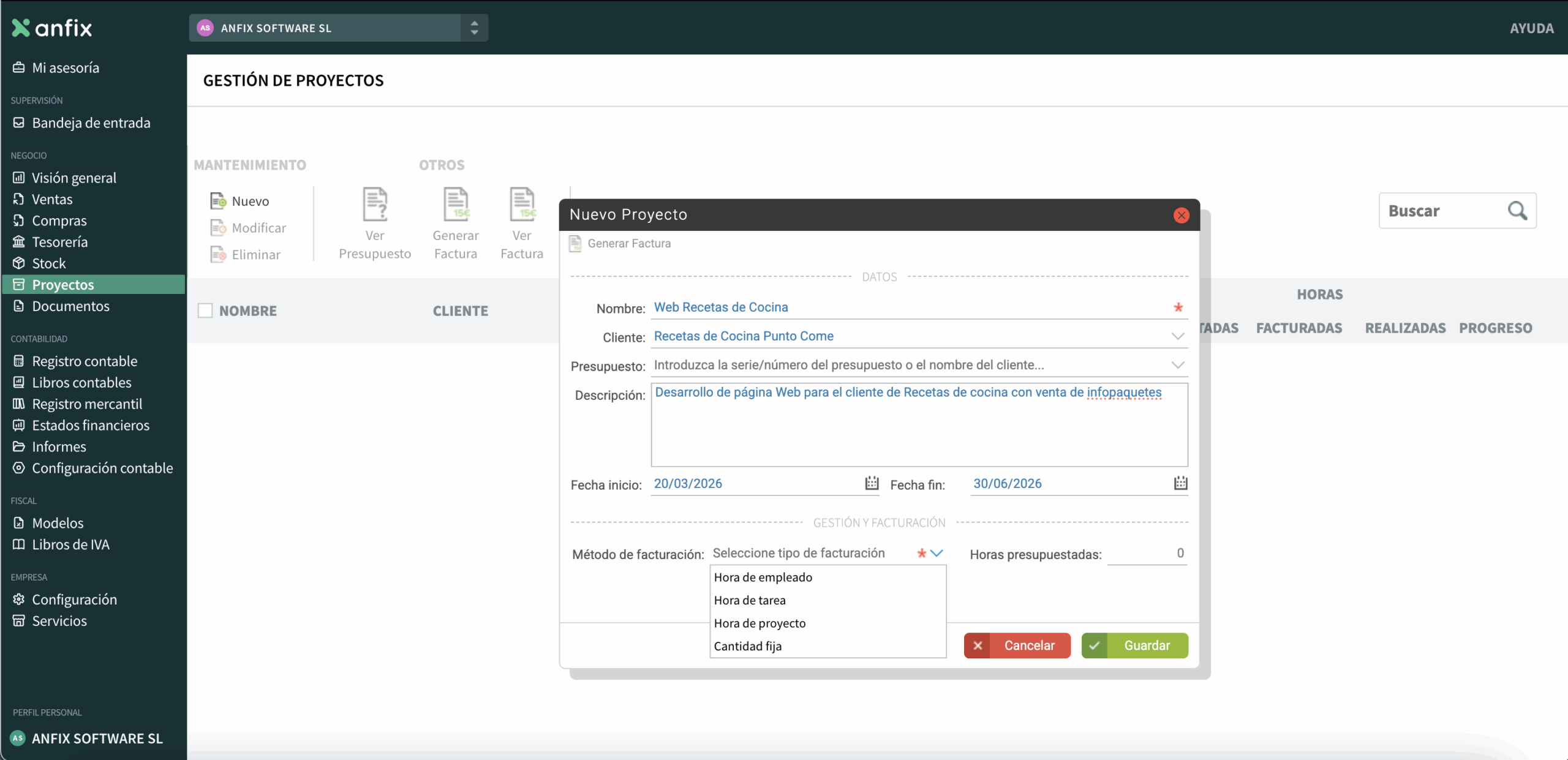En Anfix podremos crear un proyecto desde cero, o bien en base a un presupuesto (que veremos más abajo). Una vez guardado, podrás empezar a registrar horas y gastos, y después generar sus facturas.