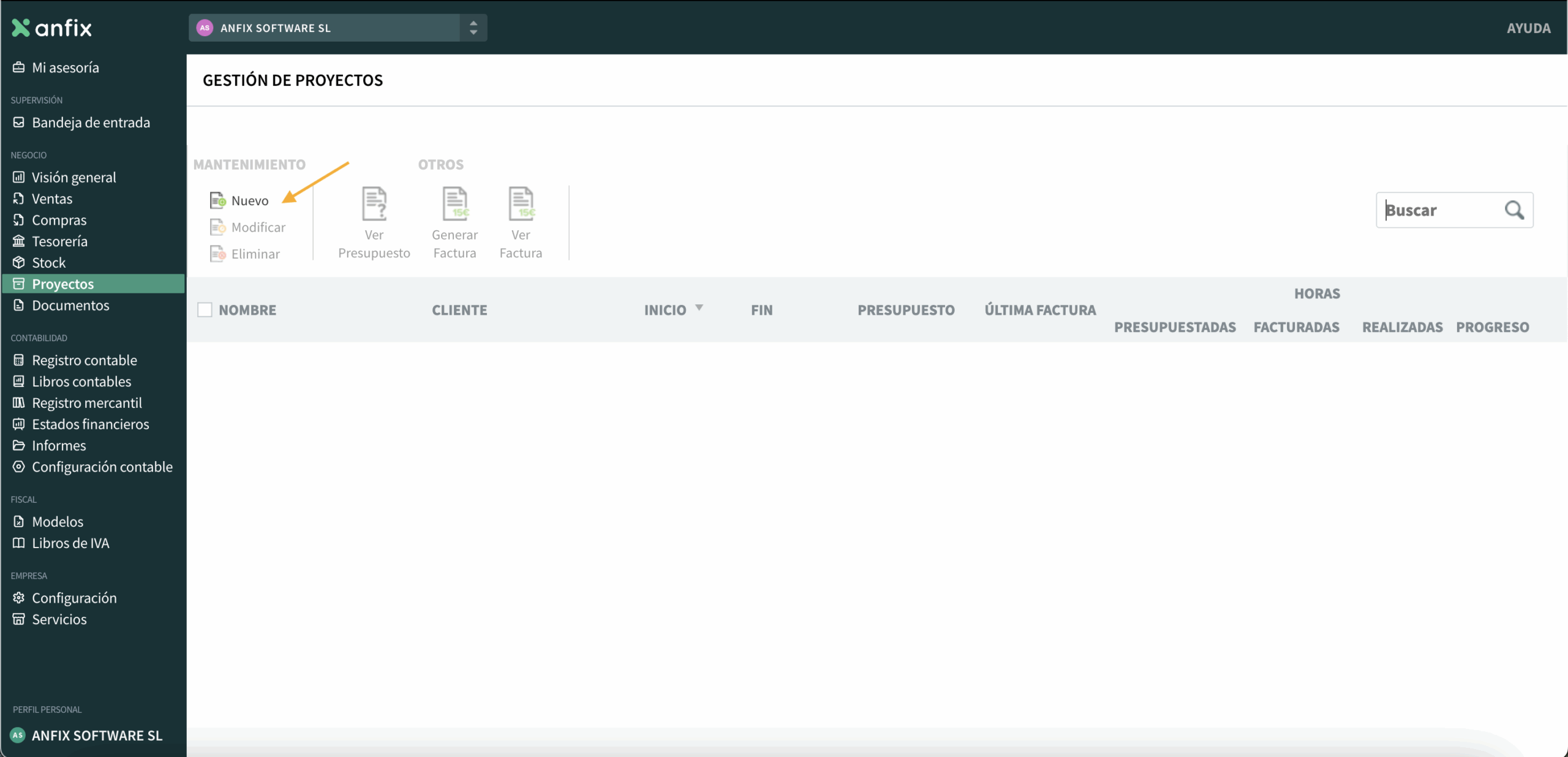 Es importante indicar que para poder crear un proyecto, primero deberemos haber dado de alta al cliente en anfix.