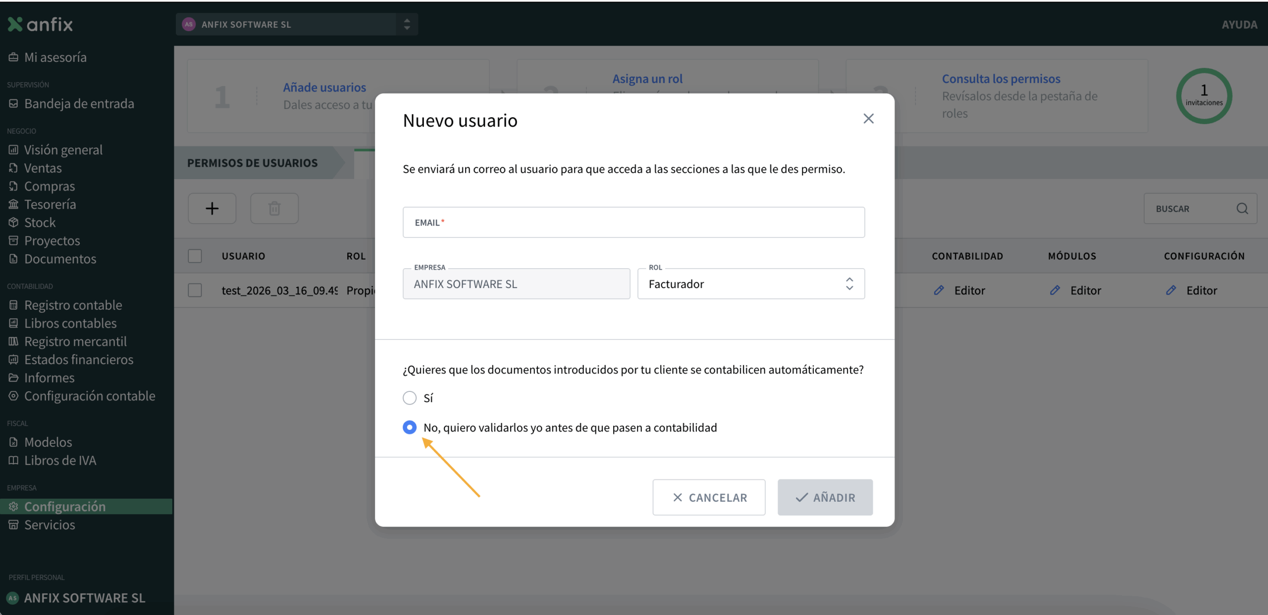 Si eres asesor y quieres usar la bandeja de entrada con una empresa, esta función se habilita cuando supervisas las operaciones de tu cliente antes de que pasen a contabilidad. Para ello, debes haber configurado los permisos del cliente colaborativo en Configuración > Permisos e indicar No en la opción ¿Quieres que los documentos introducidos por tu cliente se contabilicen automáticamente?.