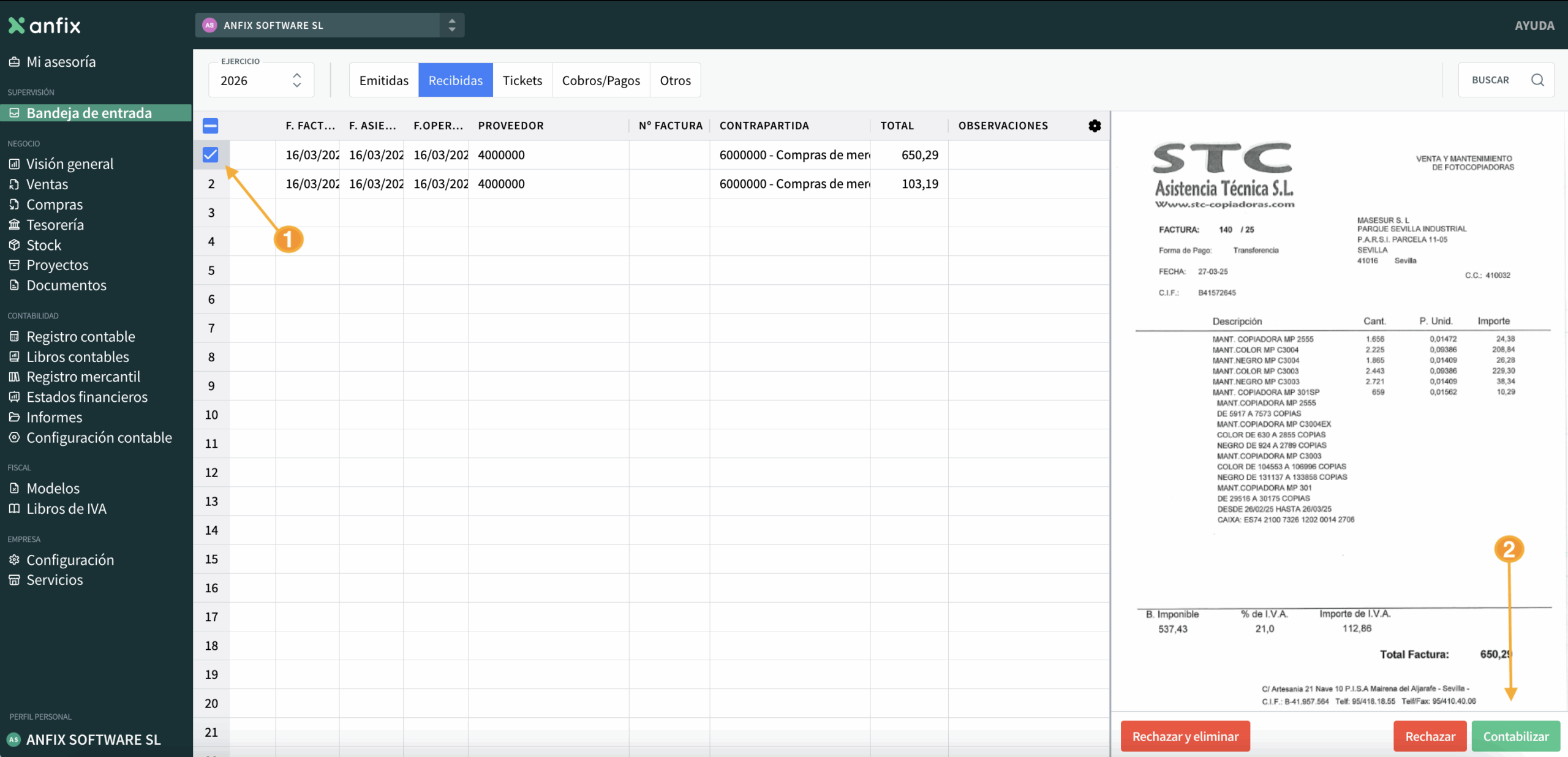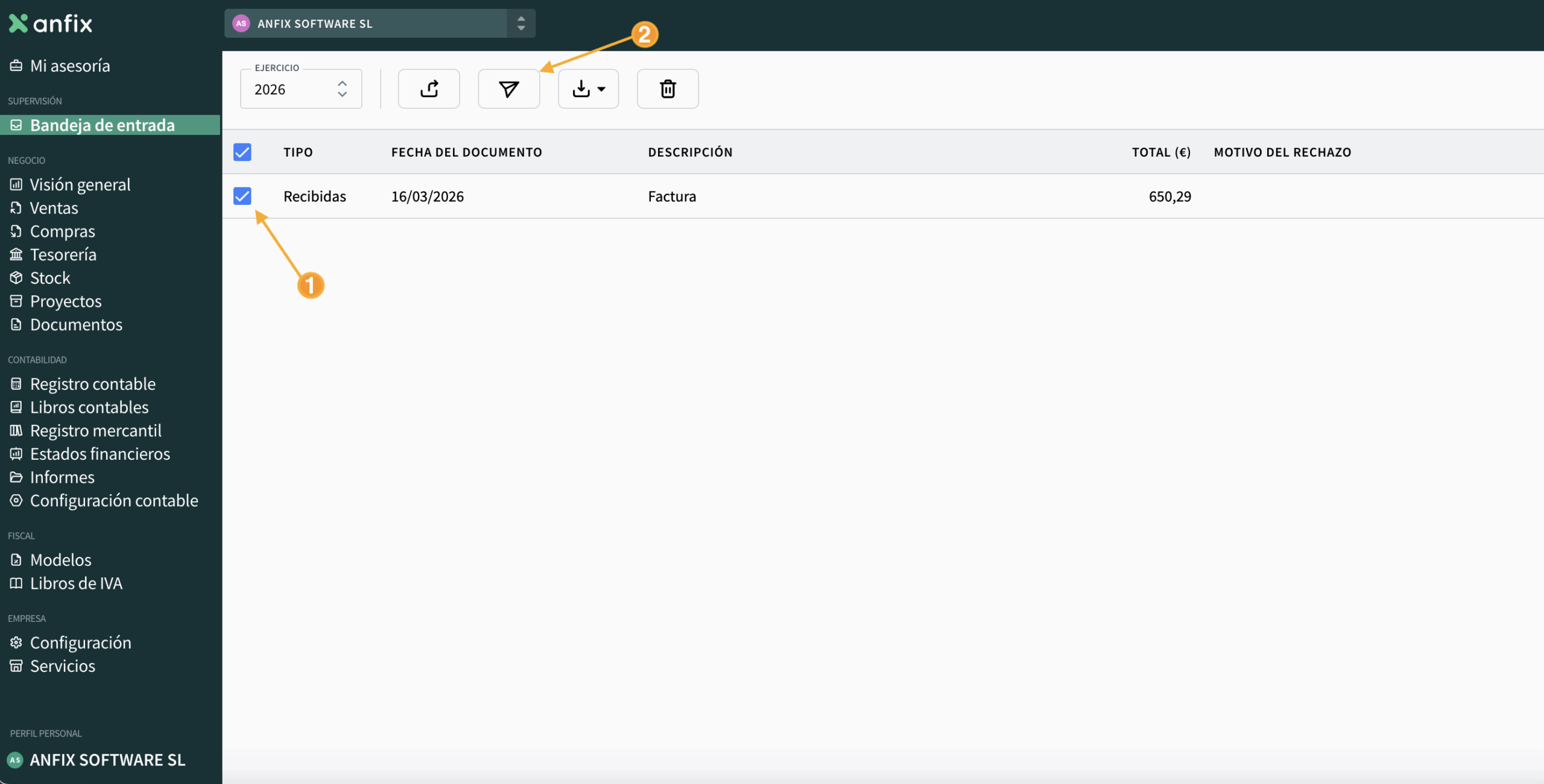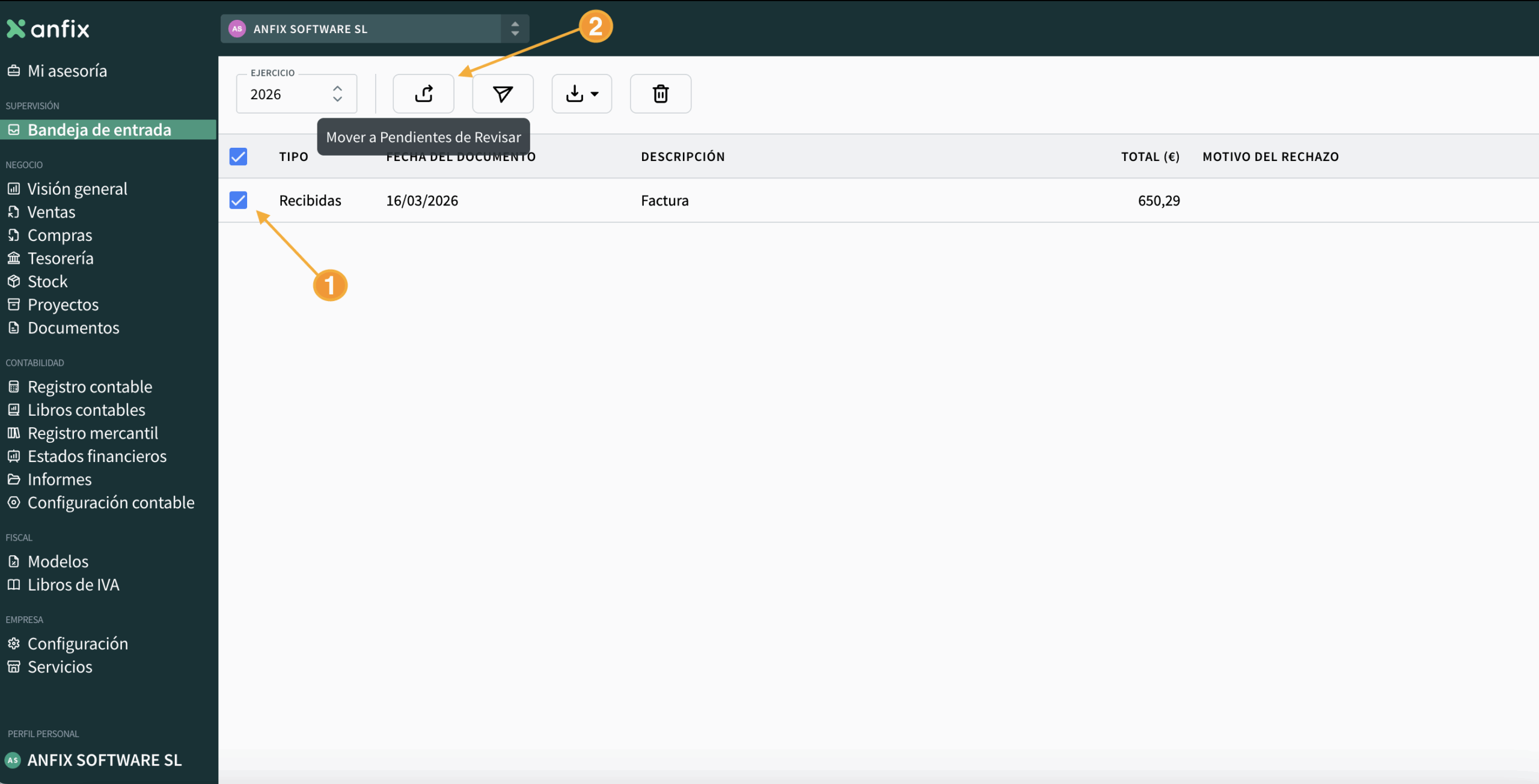 Tras pulsar sobre «bandeja de entrada» para comprobar que el documento se ha traducido, Anfix te irá indicando a través de diferentes señales visuales cuál es el nuevo documento que tenemos pendiente de revisar para, de esta manera, poder realizar su correcta revisión y posterior contabilización.