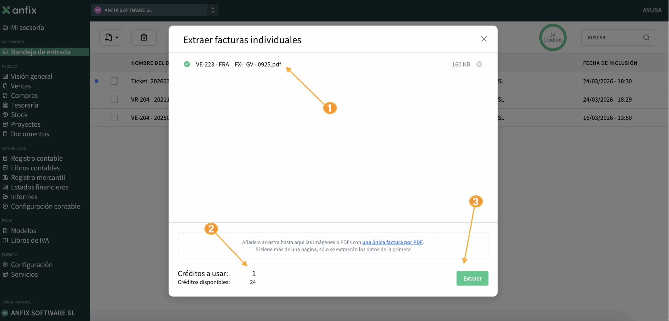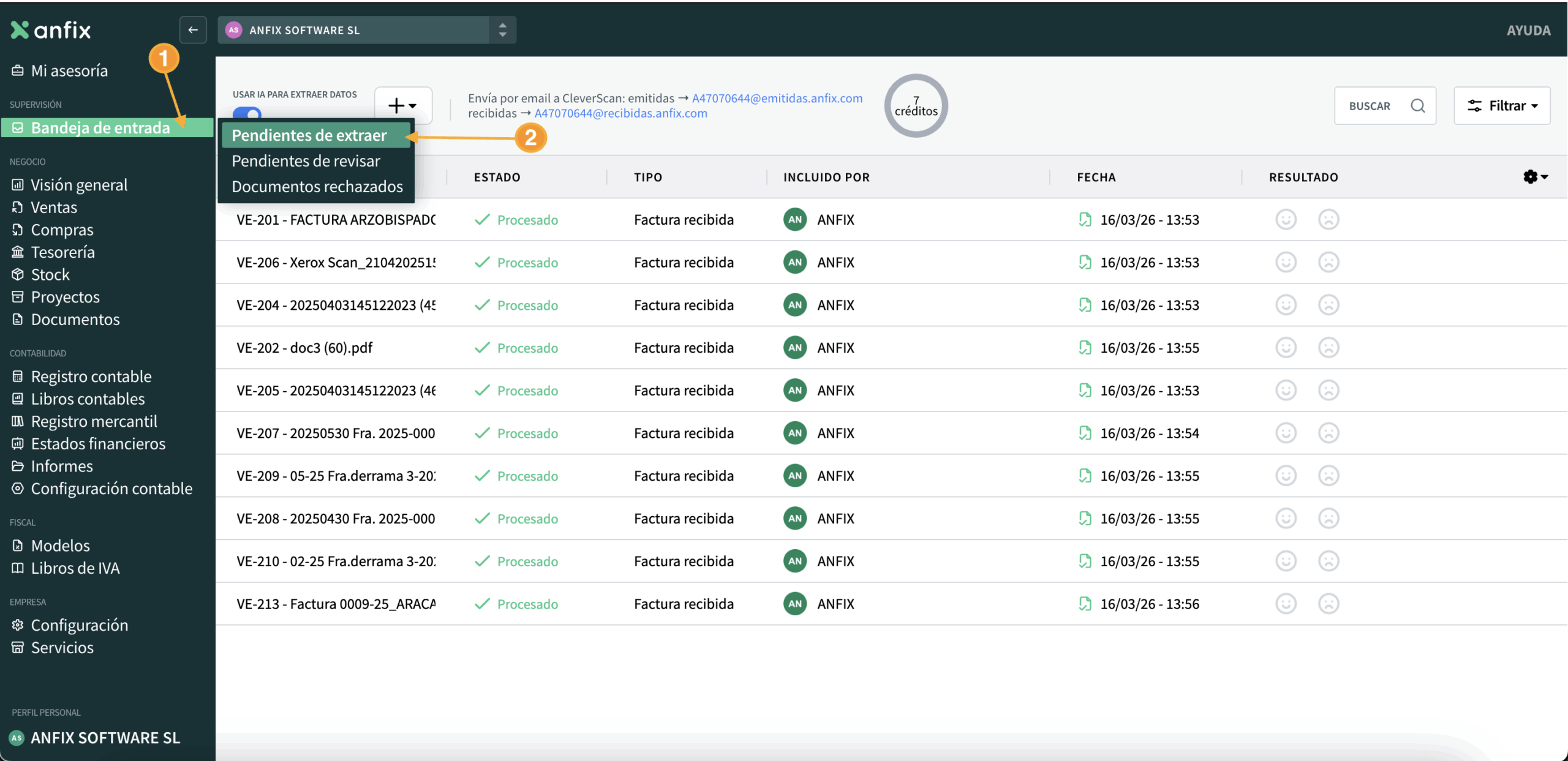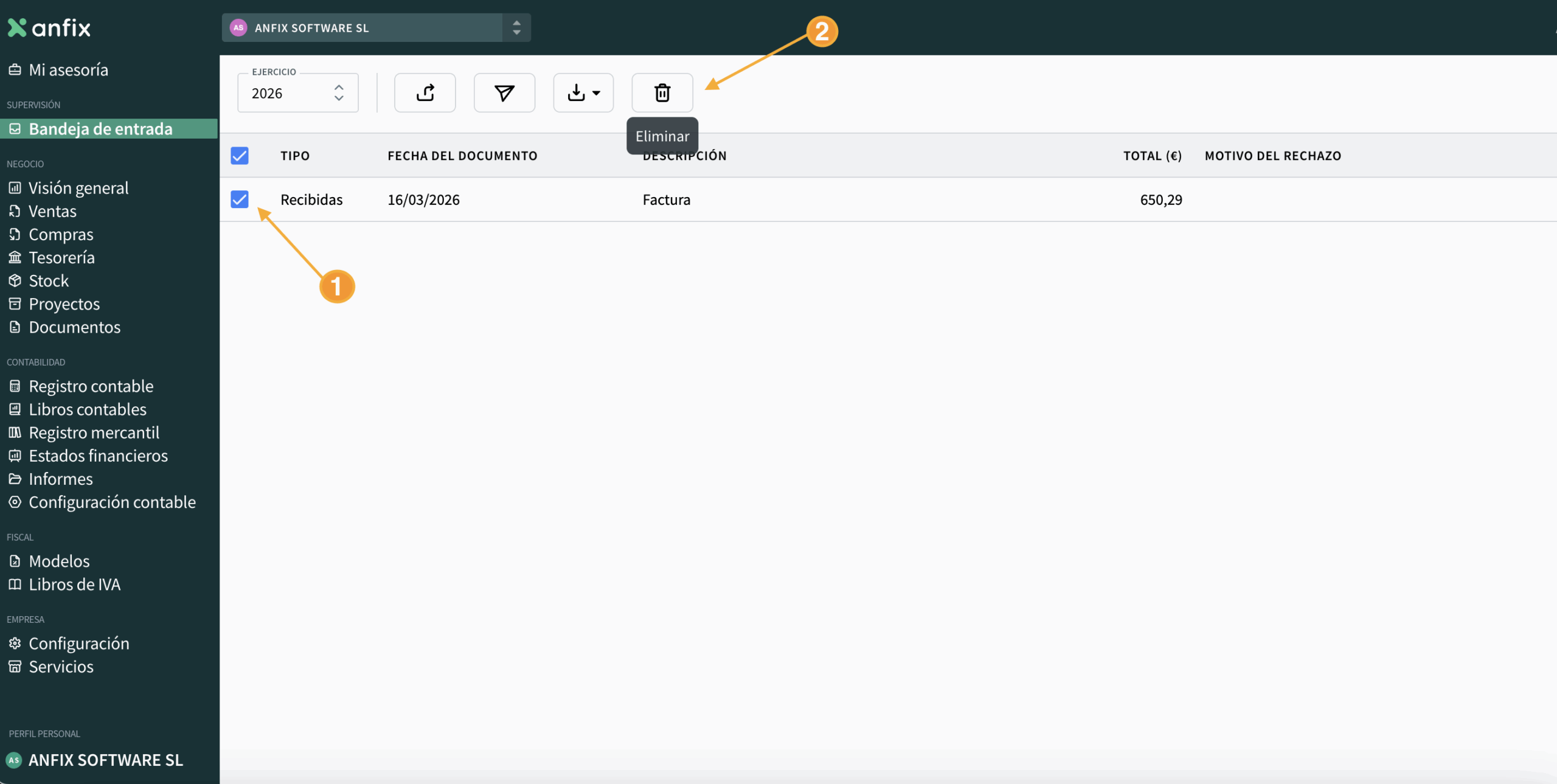 Tras pulsar sobre «bandeja de entrada» para comprobar que el documento se ha traducido, Anfix te irá indicando a través de diferentes señales visuales cuál es el nuevo documento que tenemos pendiente de revisar para, de esta manera, poder realizar su correcta revisión y posterior contabilización.
