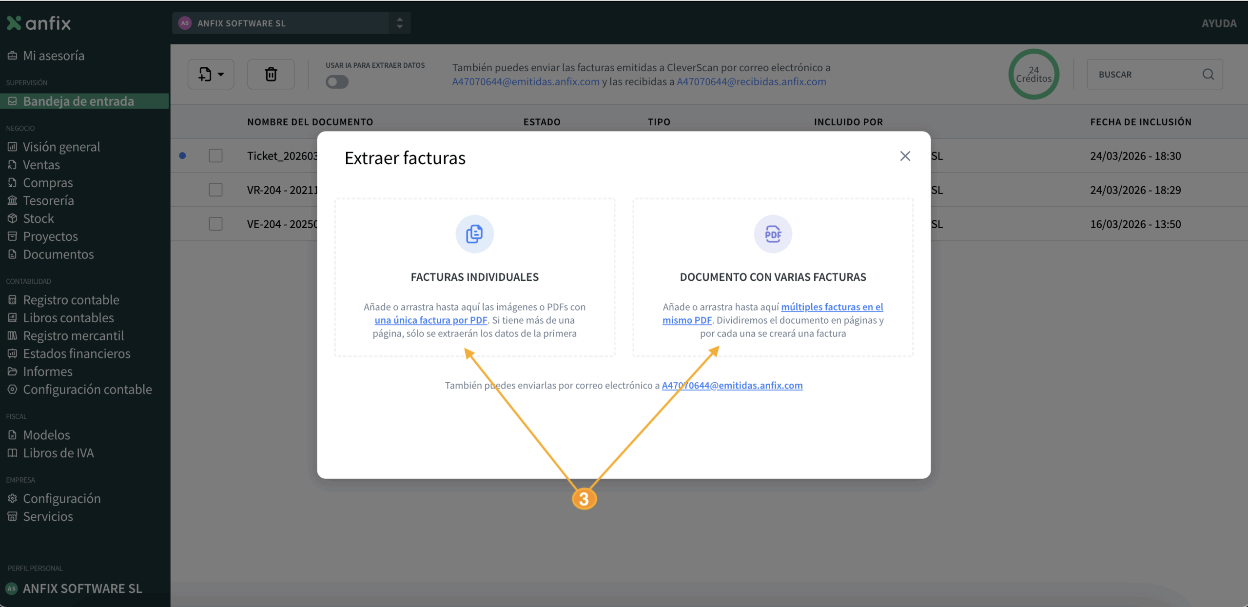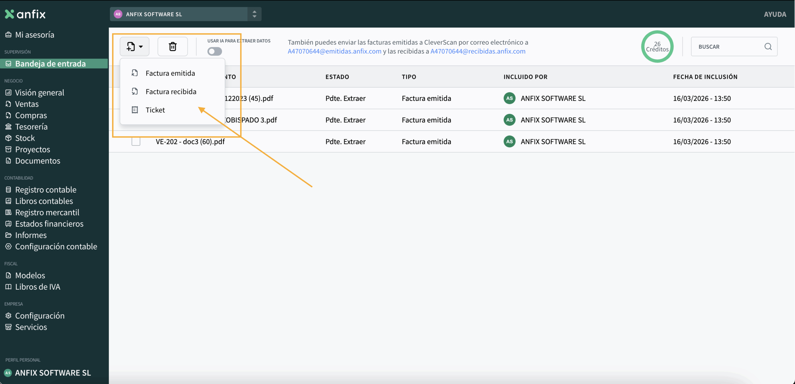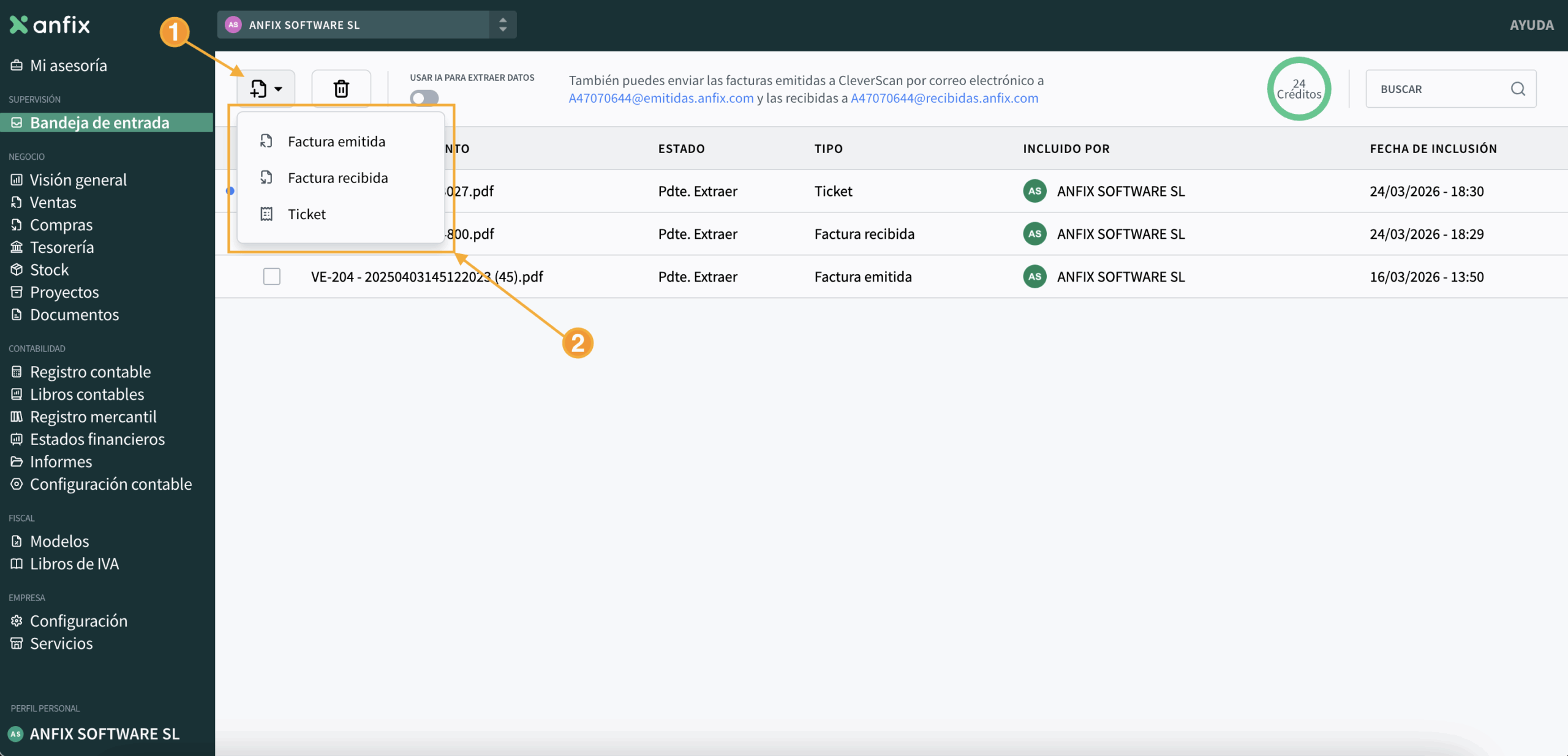 - Registra una factura desde COMPRAS, de forma manual o automática con CleverScan.
