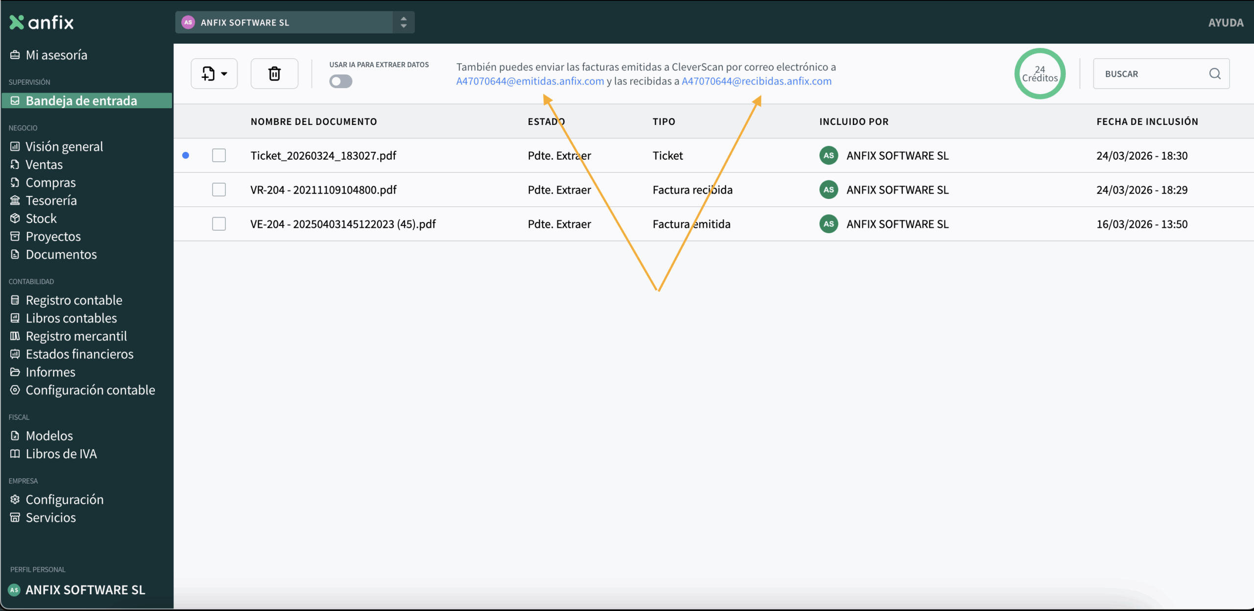 Es importante revisar bien a qué dirección envías cada documento, ya que CleverScan lo enviará después a Ventas o Compras y generará la contabilidad en consecuencia.