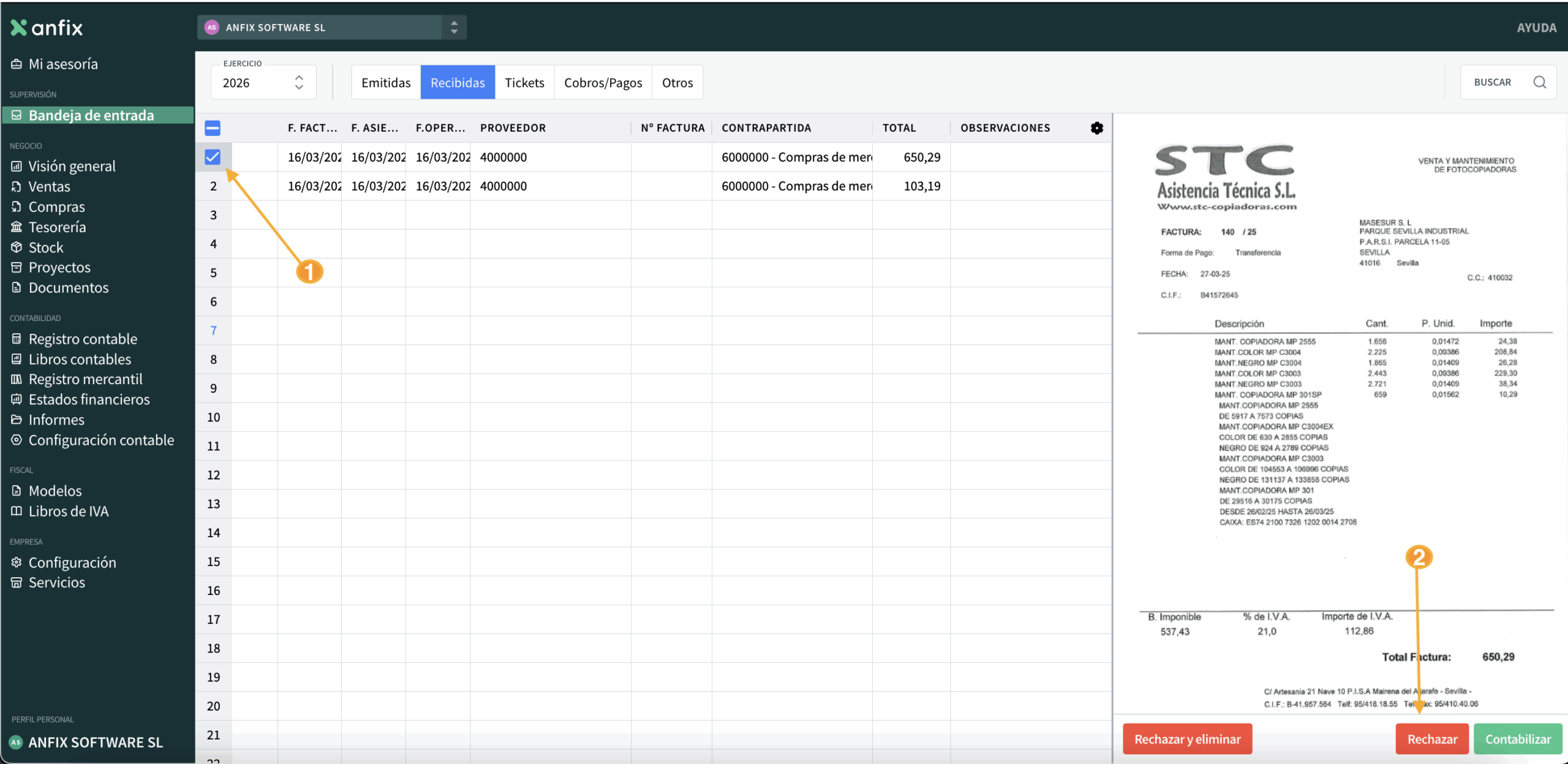 Seleccionando el documento y pulsando en «RECHAZAR», el documento NO se contabiliza. A partir de este momento aparecerá en la pestaña de «RECHAZADOS».