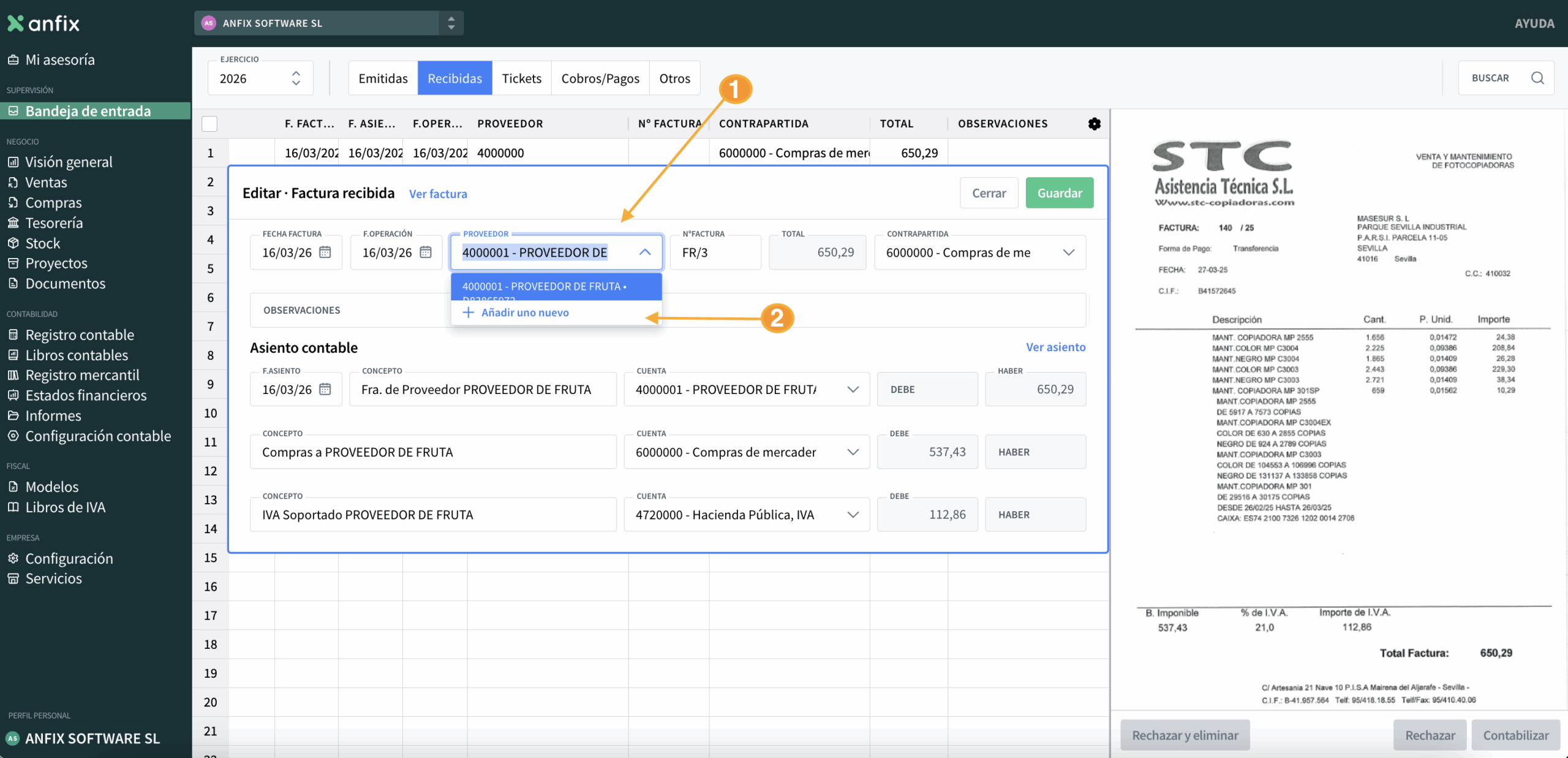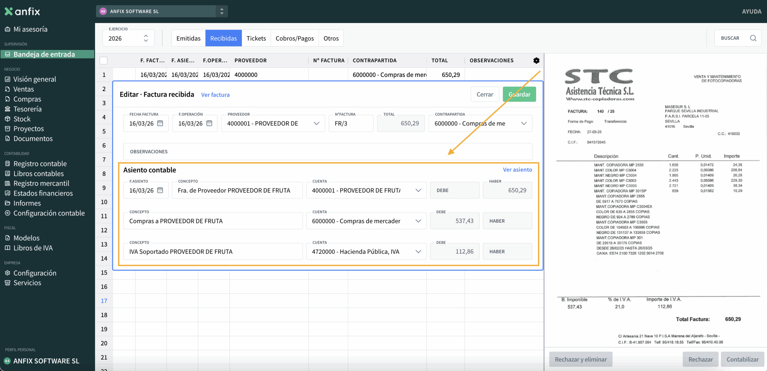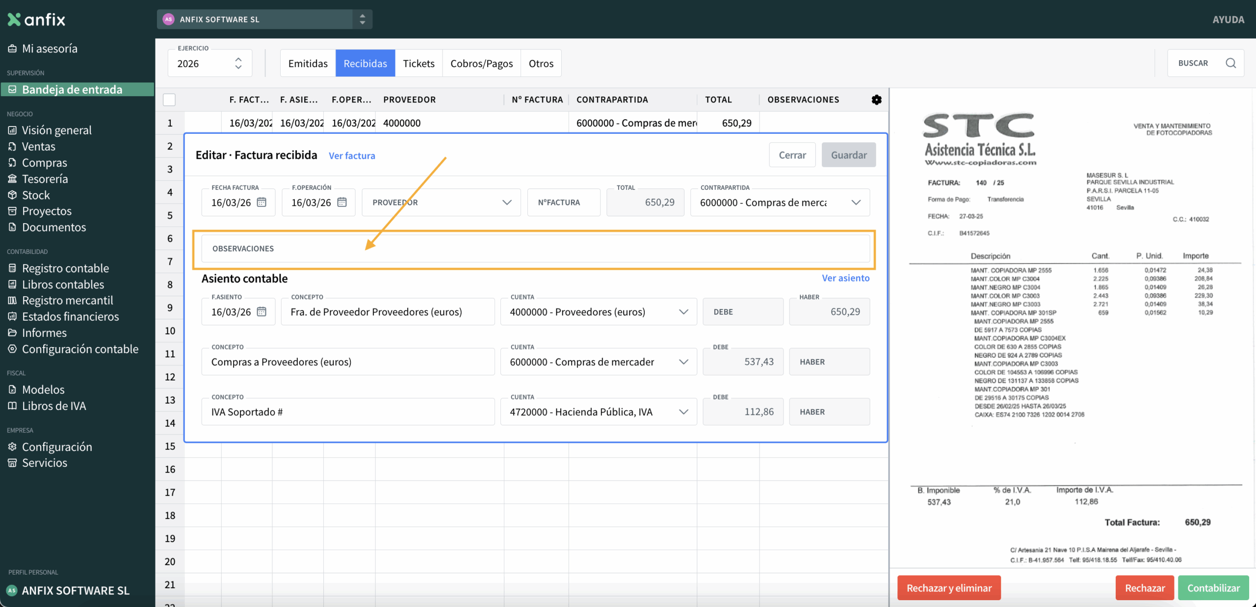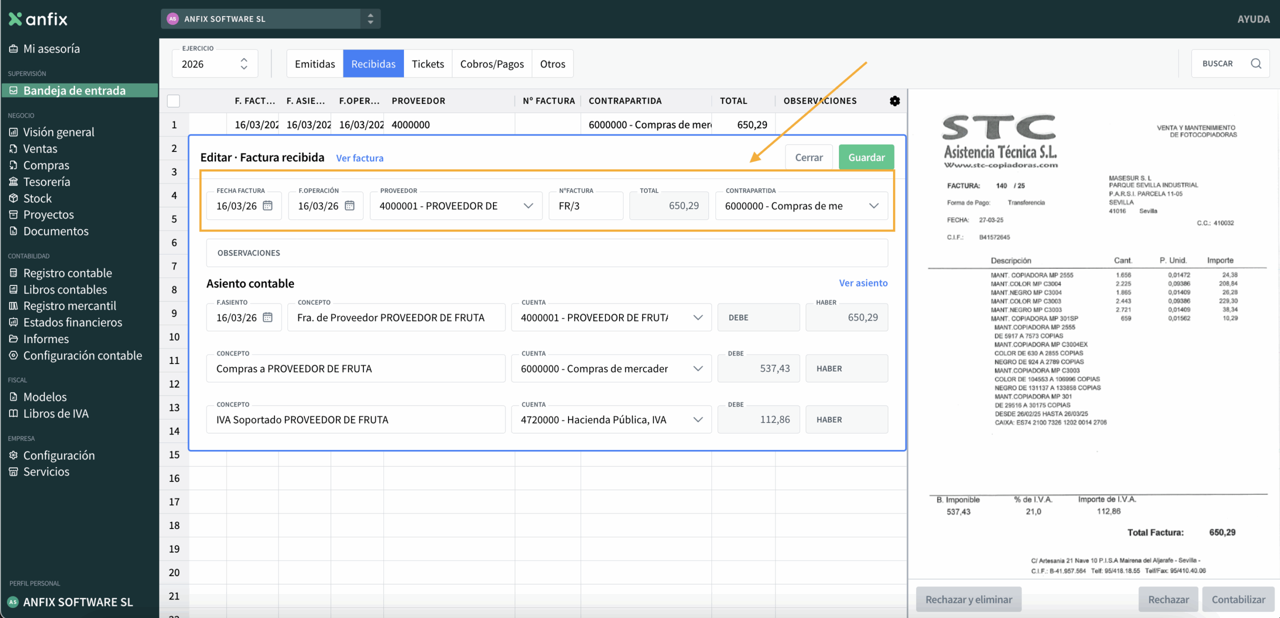 - Una vez estén estos datos desplegados podremos modificarlos y tras seleccionar contabilizar se generará el asiento contable en firme y el documento desaparecerá de la bandeja de entrada.