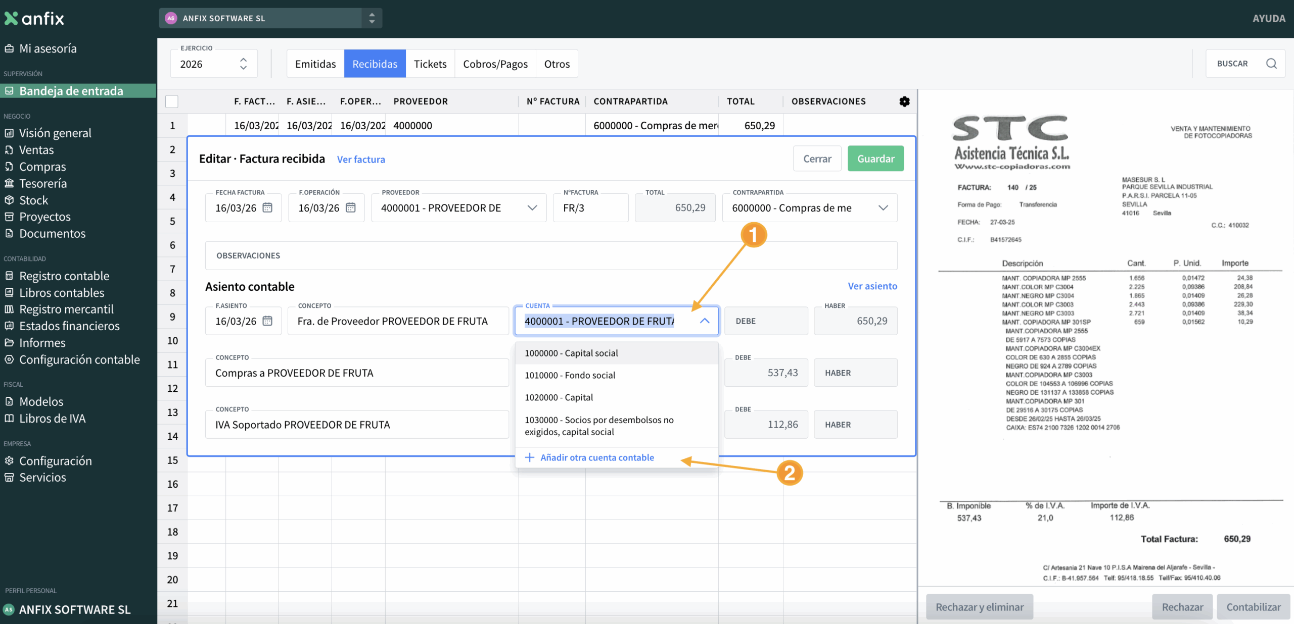 - También podremos crear una nueva cuenta contable de gasto o ingreso. Para ello deberás abrir el desplegable de la cuenta contable (1) y a continuación pulsar sobre «añadir otra cuenta contable» (2)