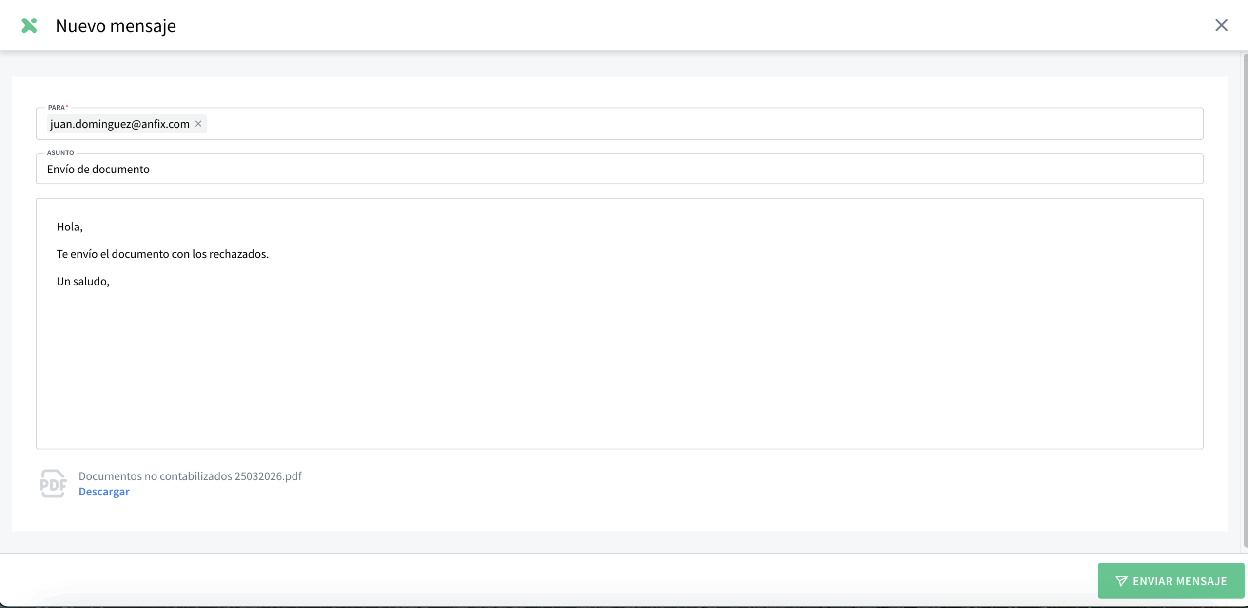 - Si rechazas el documento, la observación se incluirá en el correo que envíes al cliente desde la pestaña Rechazados