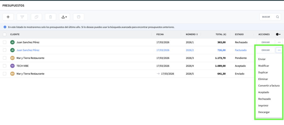 - Cuando envíes el presupuesto al cliente, este aparecerá como: Enviado.