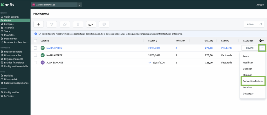 - Después de seleccionar Convertir en factura, Anfix generará la factura a partir de la proforma.