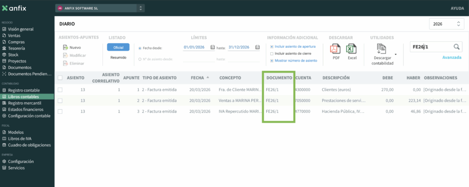 Además, Anfix generará automáticamente el asiento contable en Contabilidad. La fecha de ese asiento será la del día en que conviertas la proforma en factura, y en el campo Documento aparecerán la serie y el número de la factura.