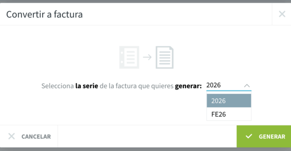 - Si tienes configuradas varias series para tus facturas emitidas, se abrirá una pantalla para que elijas la serie correspondiente. Si solo trabajas con una serie para las facturas, se generará la emitida de forma automática.