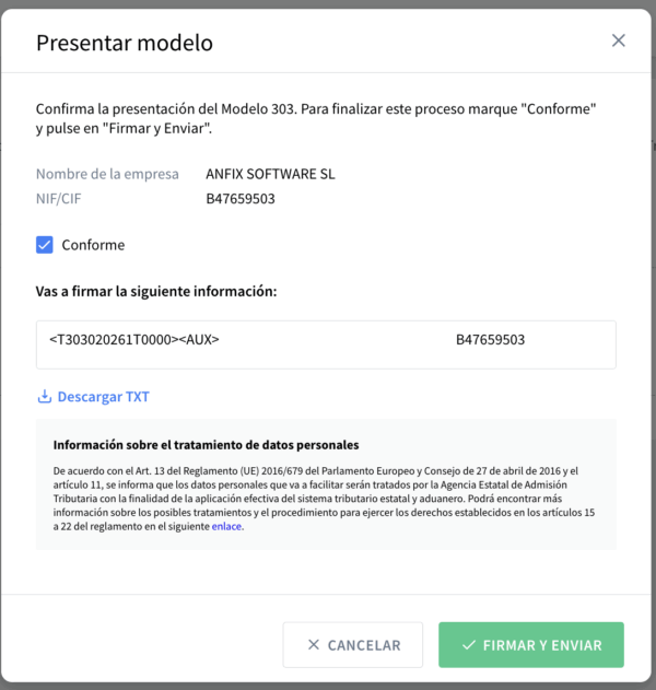 Con esta funcionalidad puedes presentar el modelo 303 directamente en la AEAT desde Anfix, sin necesidad de descargar y subir manualmente un fichero TXT. Además, la conexión con la AEAT se realiza en tiempo real y, si la presentación se completa correctamente, Anfix adjunta automáticamente el justificante al modelo.