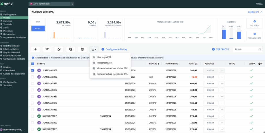 Desde el listado de facturas emitidas puedes realizar estas acciones sobre las facturas seleccionadas: