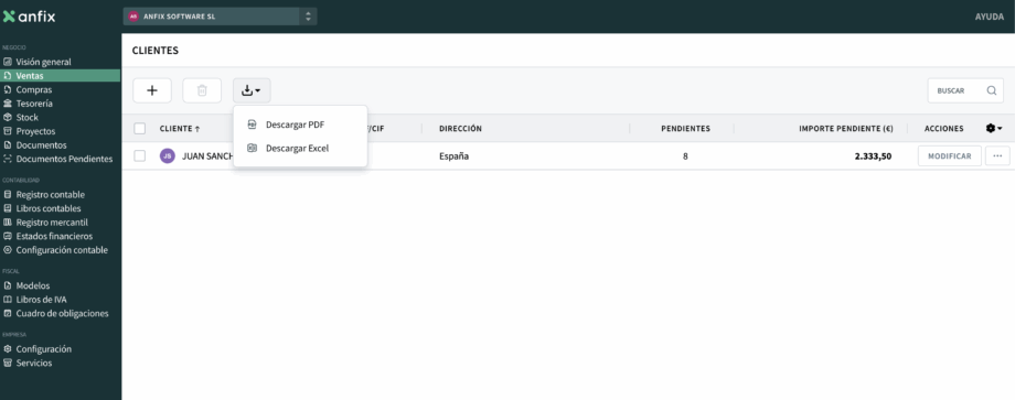 Desde el listado de clientes puedes ver la información general de tus clientes y descargarla en formato Excel o PDF.
