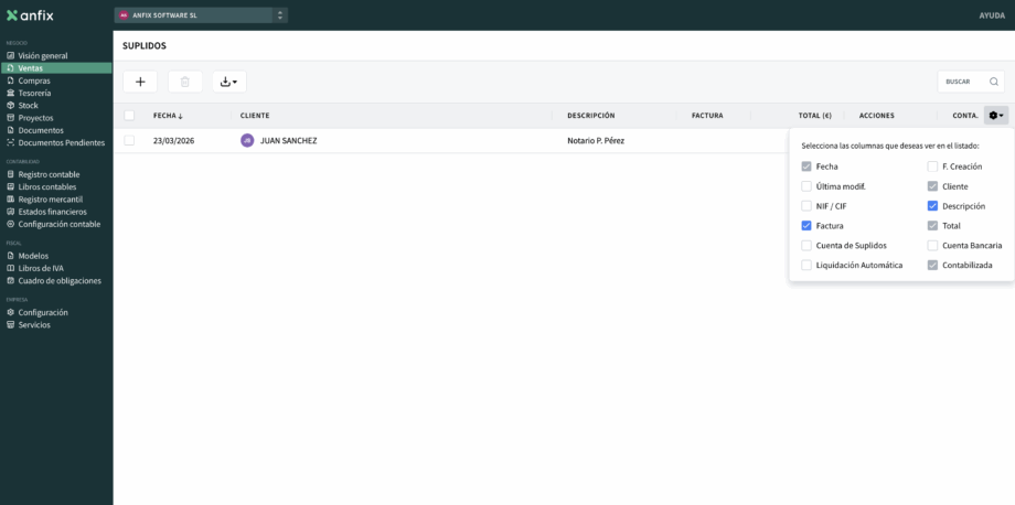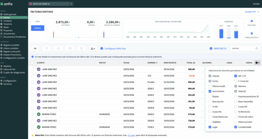 Columnas configurables en facturas emitidas