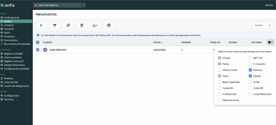 Configurar el listado de presupuestos