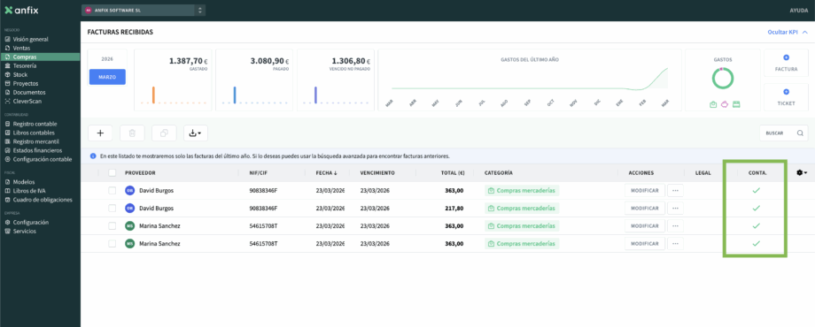 Cuando registras una factura de compra, Anfix genera su asiento contable correspondiente. Desde el listado de facturas recibidas, puedes comprobar fácilmente si ese asiento ya se ha creado.