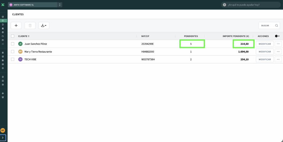 Desde Negocio > Ventas > Clientes puedes ver cuántas facturas pendientes tiene cada cliente y el importe total pendiente. Además, desde la ficha del cliente puedes consultar el detalle de sus facturas y filtrarlas por periodo.