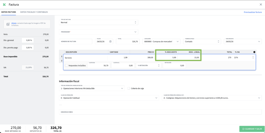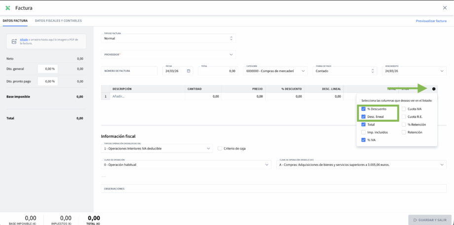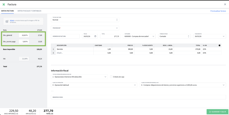 Si necesitas aplicar un descuento general a toda la factura, o un descuento por pronto pago, puedes hacerlo desde el panel lateral izquierdo.