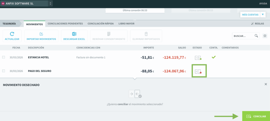 Si solo necesitas desechar un movimiento bancario, puedes hacerlo desde Negocio → Tesorería → Conciliaciones pendientes. Pulsa aquí para ver cómo.