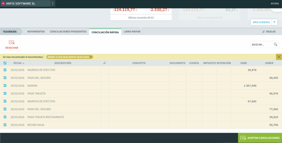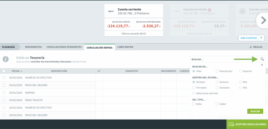 - Accede a Negocio →Tesorería → Conciliación rápida.