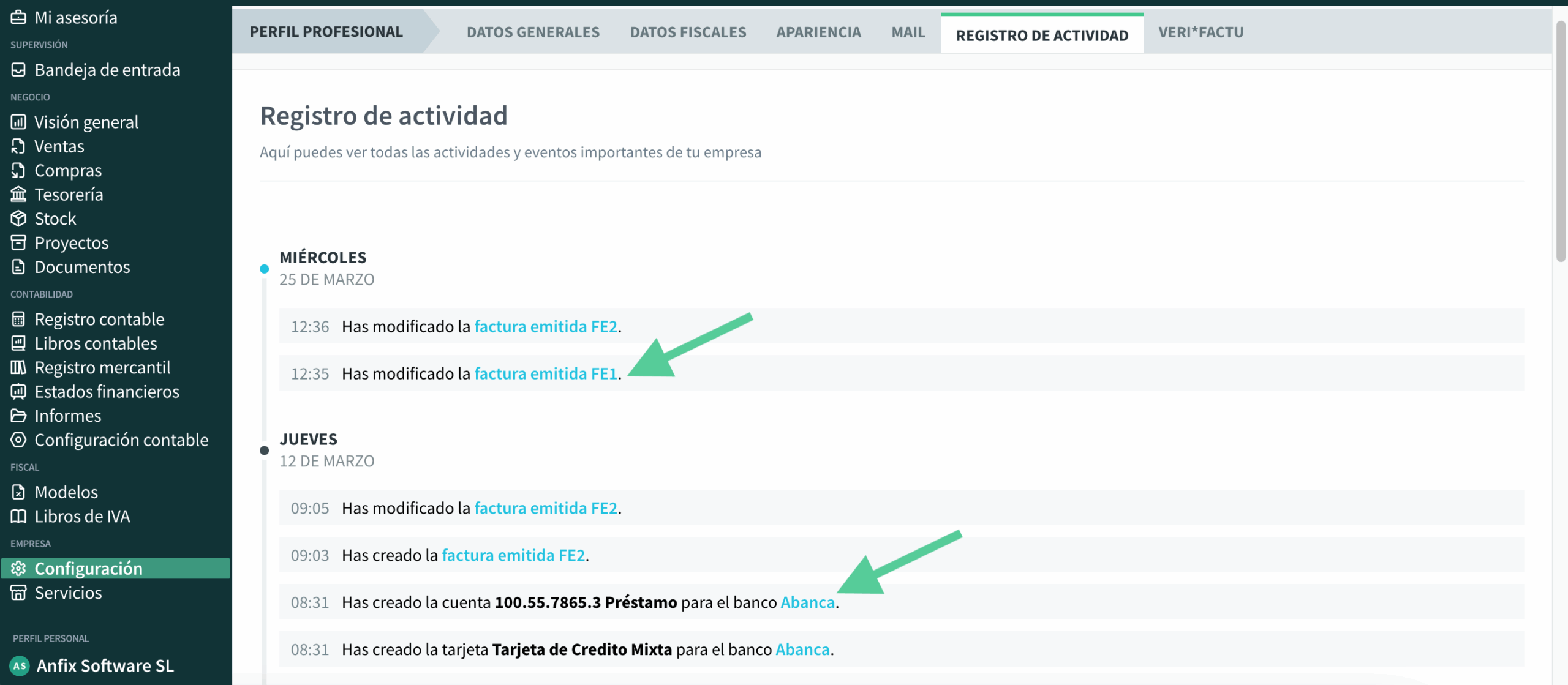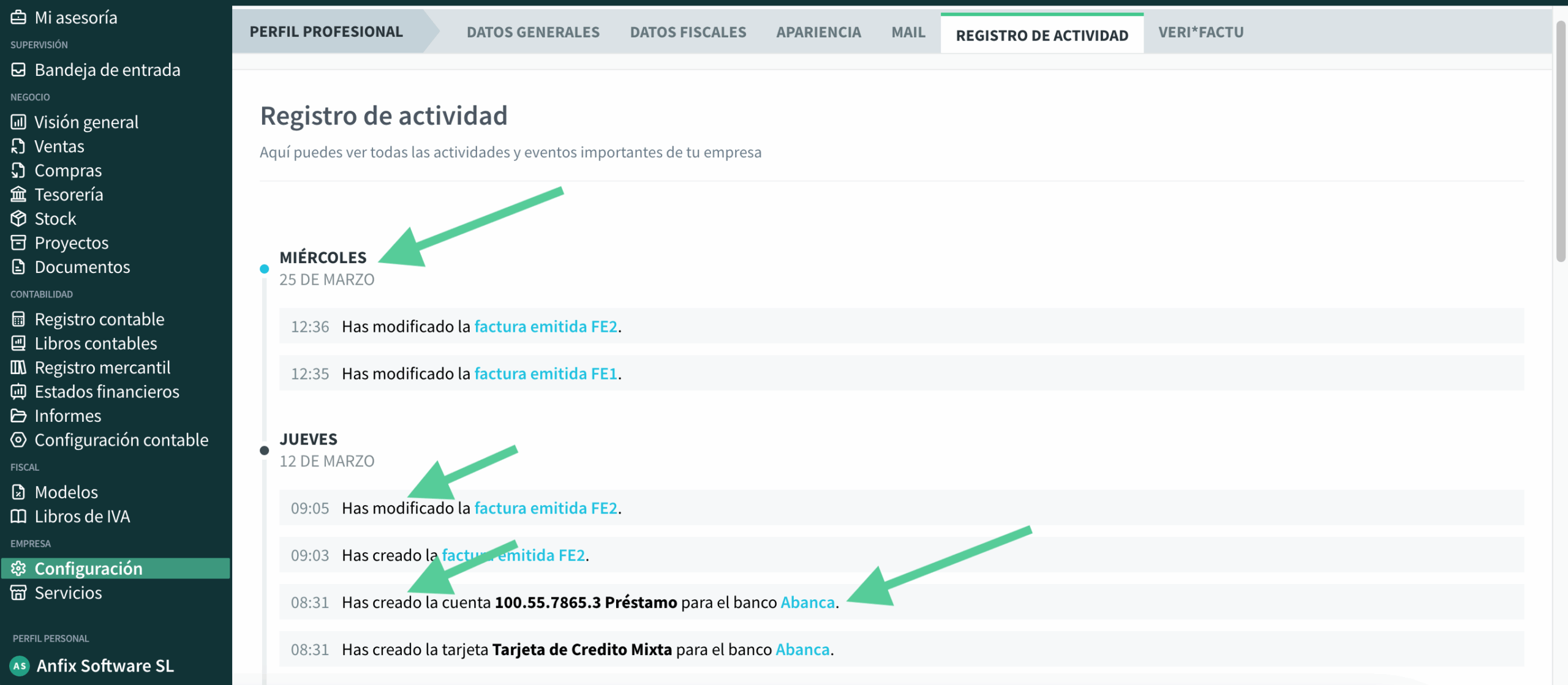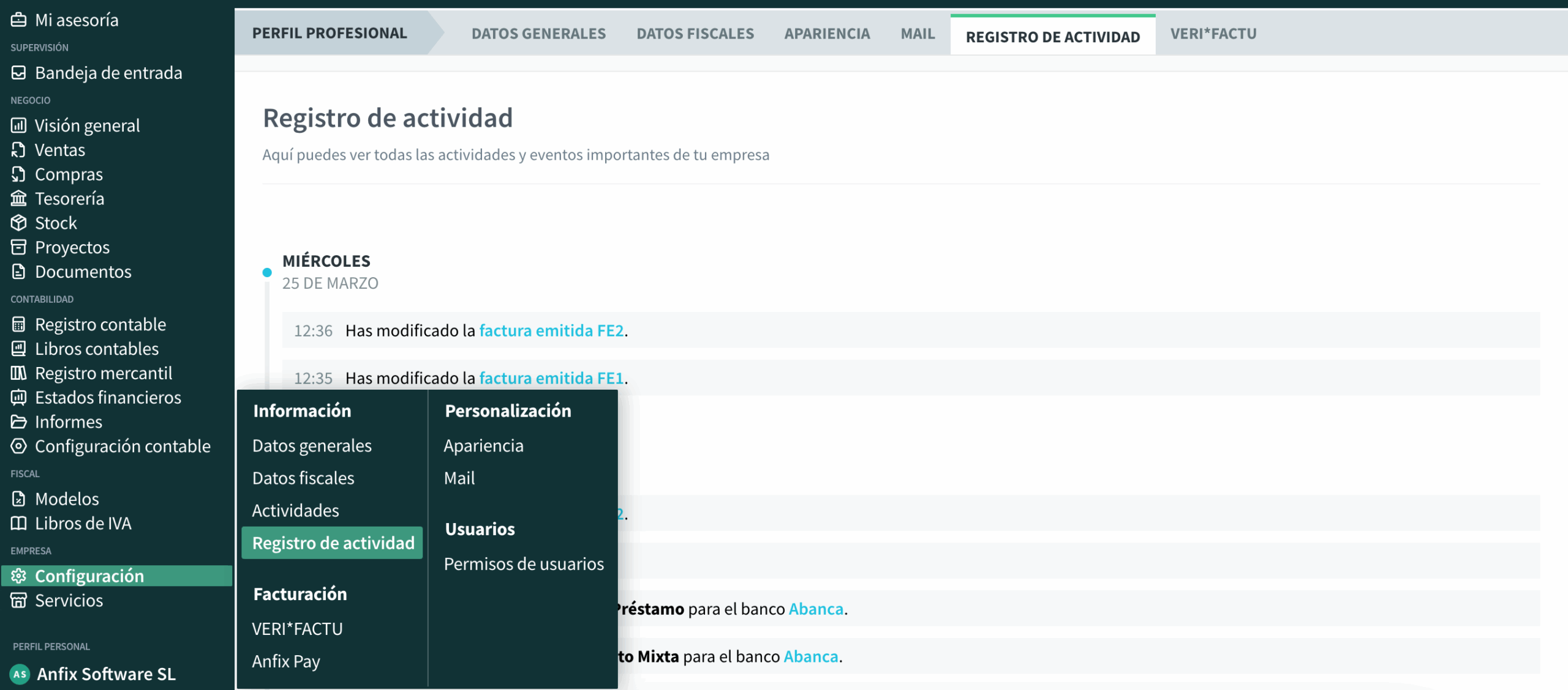 Desde el apartado Registro de actividad puedes consultar, en formato cronológico, las acciones que se van realizando en la empresa.