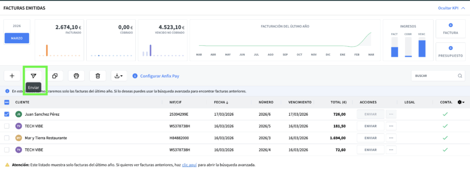 2. Localiza la factura que quieres enviar y selecciónala marcando la casilla de la izquierda.