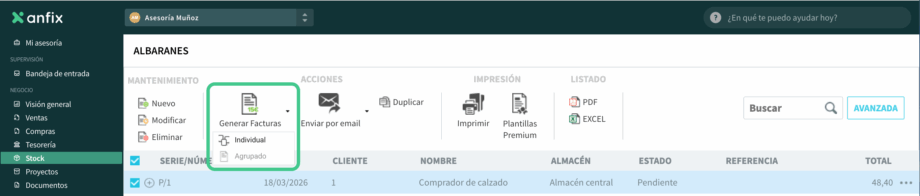 Si ya has creado un albarán de salida, puedes generar la factura desde Stock → Albaranes. Selecciona el albarán y pulsa en Generar facturas.