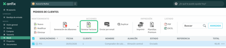 También puedes generar la factura directamente desde un pedido, sin haber creado antes un albarán. Para hacerlo, entra en Stock → Pedidos de clientes, selecciona el pedido y pulsa en Generar facturas.