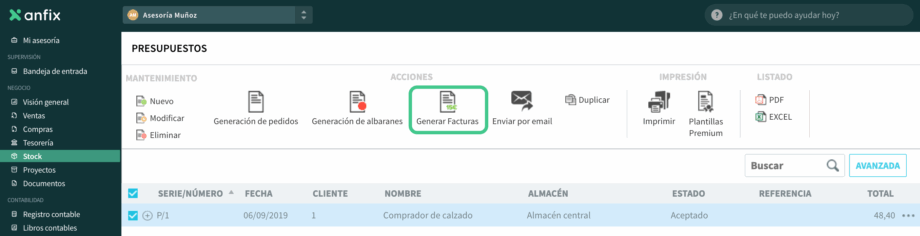 Otra opción es generar la factura directamente desde un presupuesto, sin pasar por pedido ni albarán. Para ello, ve a Stock → Presupuestos, selecciona el presupuesto y pulsa en Generar facturas.