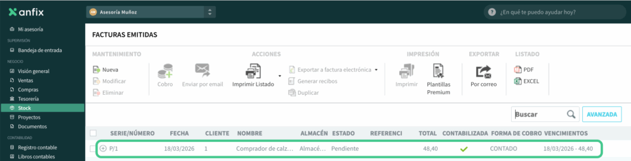 La factura quedará disponible en Stock → Facturas emitidas y también podrás consultarla desde Ventas y Contabilidad.