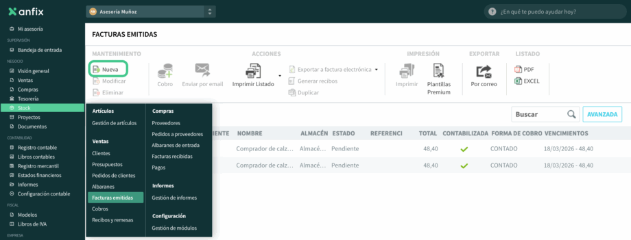 Si no has creado antes un presupuesto, pedido o albarán, puedes registrar la factura manualmente desde Stock → Facturas emitidas y pulsar en Nueva.
