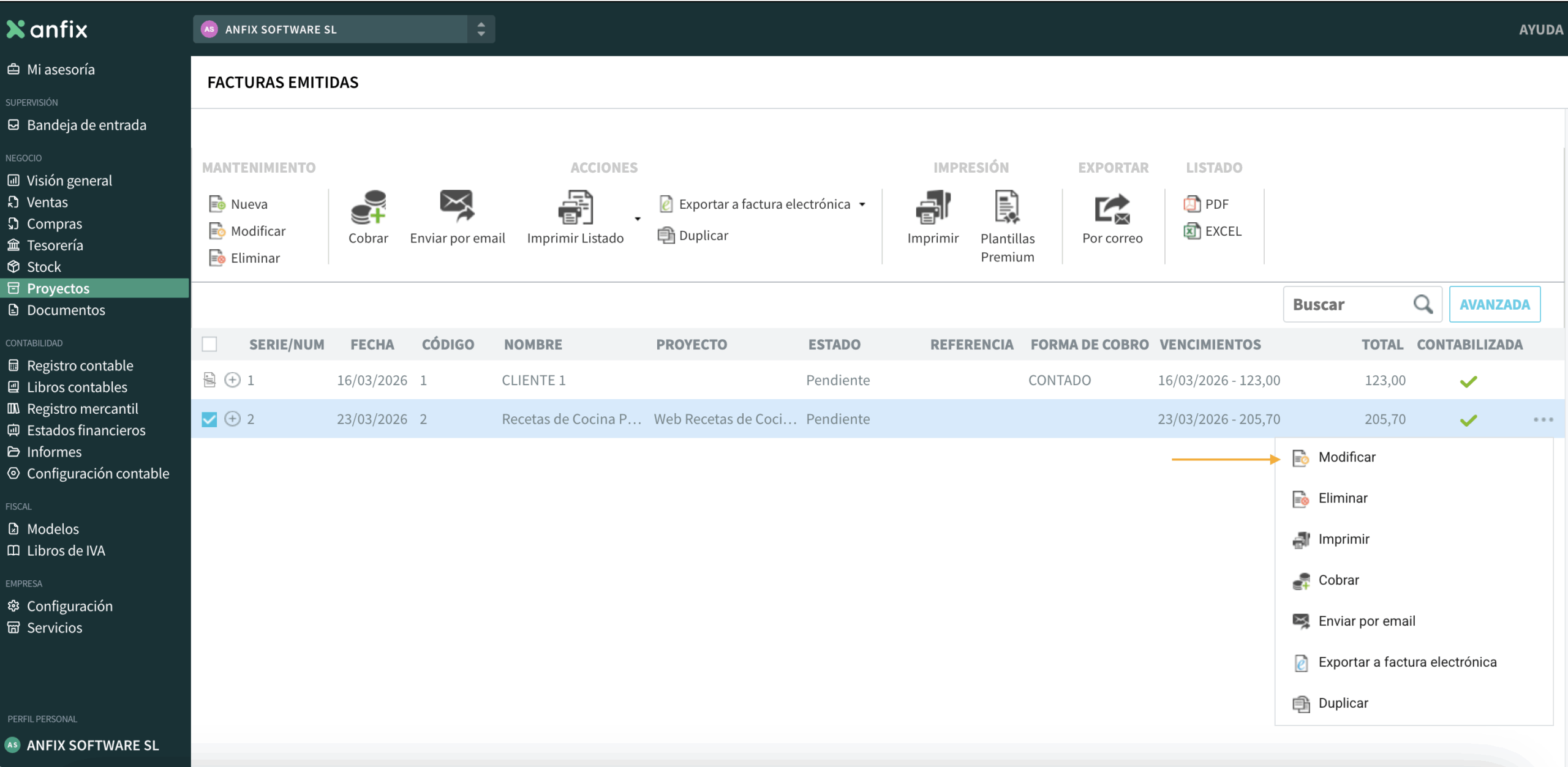 Haciendo doble click o seleccionando la factura y pulsando en «Modificar» accederemos a sus datos.