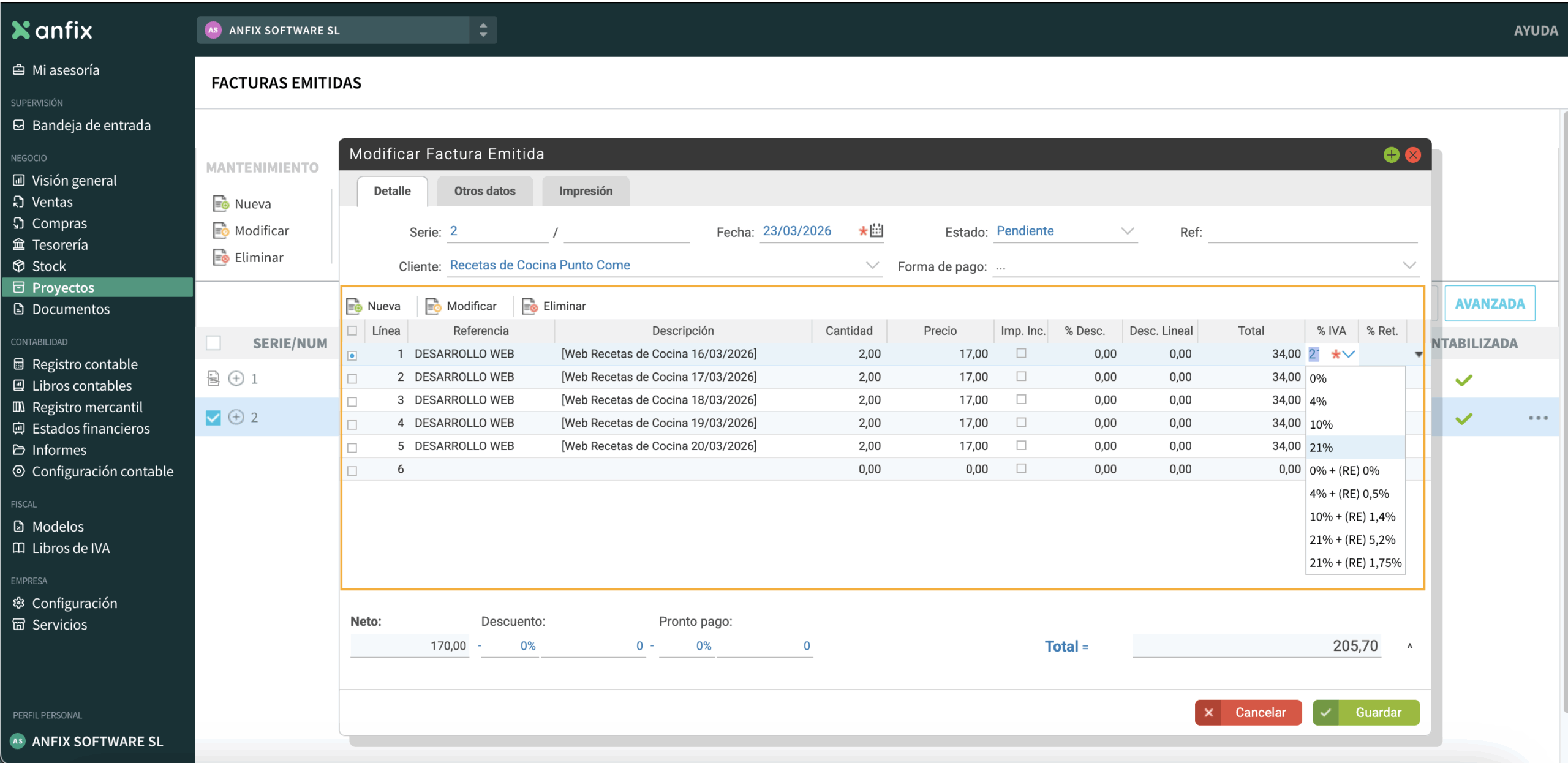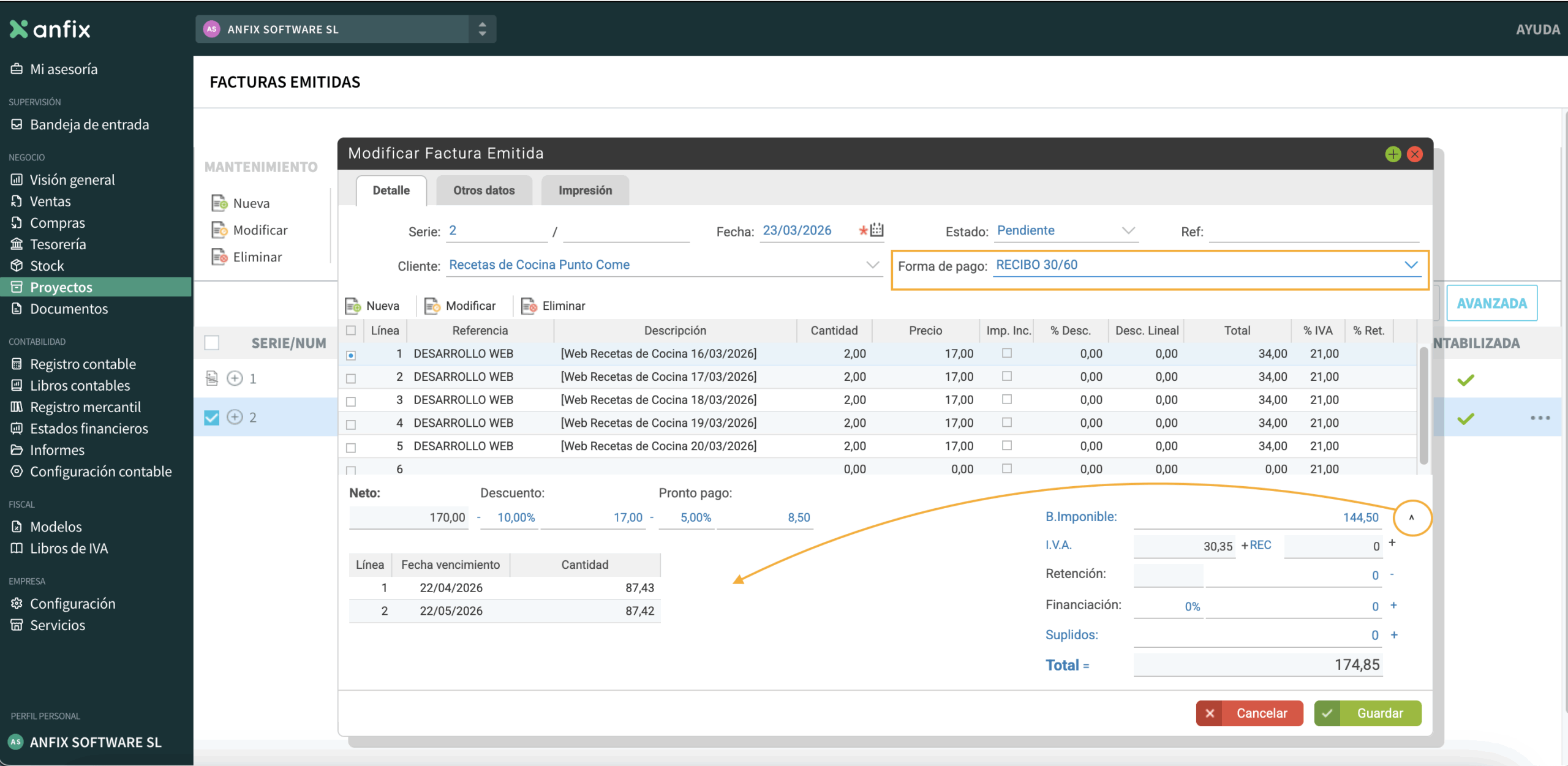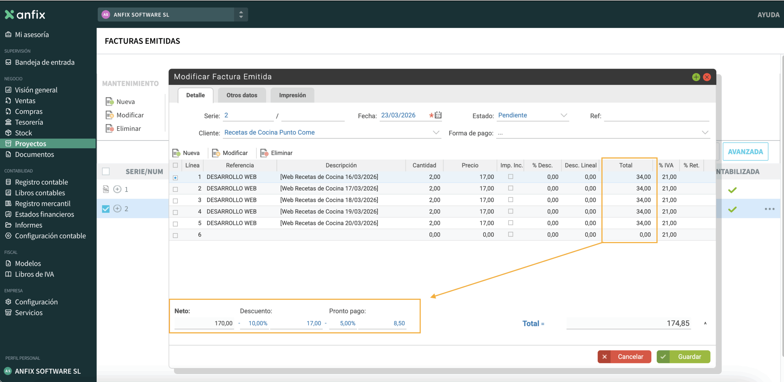 Desde el módulo de Proyectos puedes consultar, revisar y modificar las facturas emitidas. En este apartado también puedes ver su detalle, ajustar datos de facturación y revisar importes, impuestos, vencimientos y otros datos asociados.
