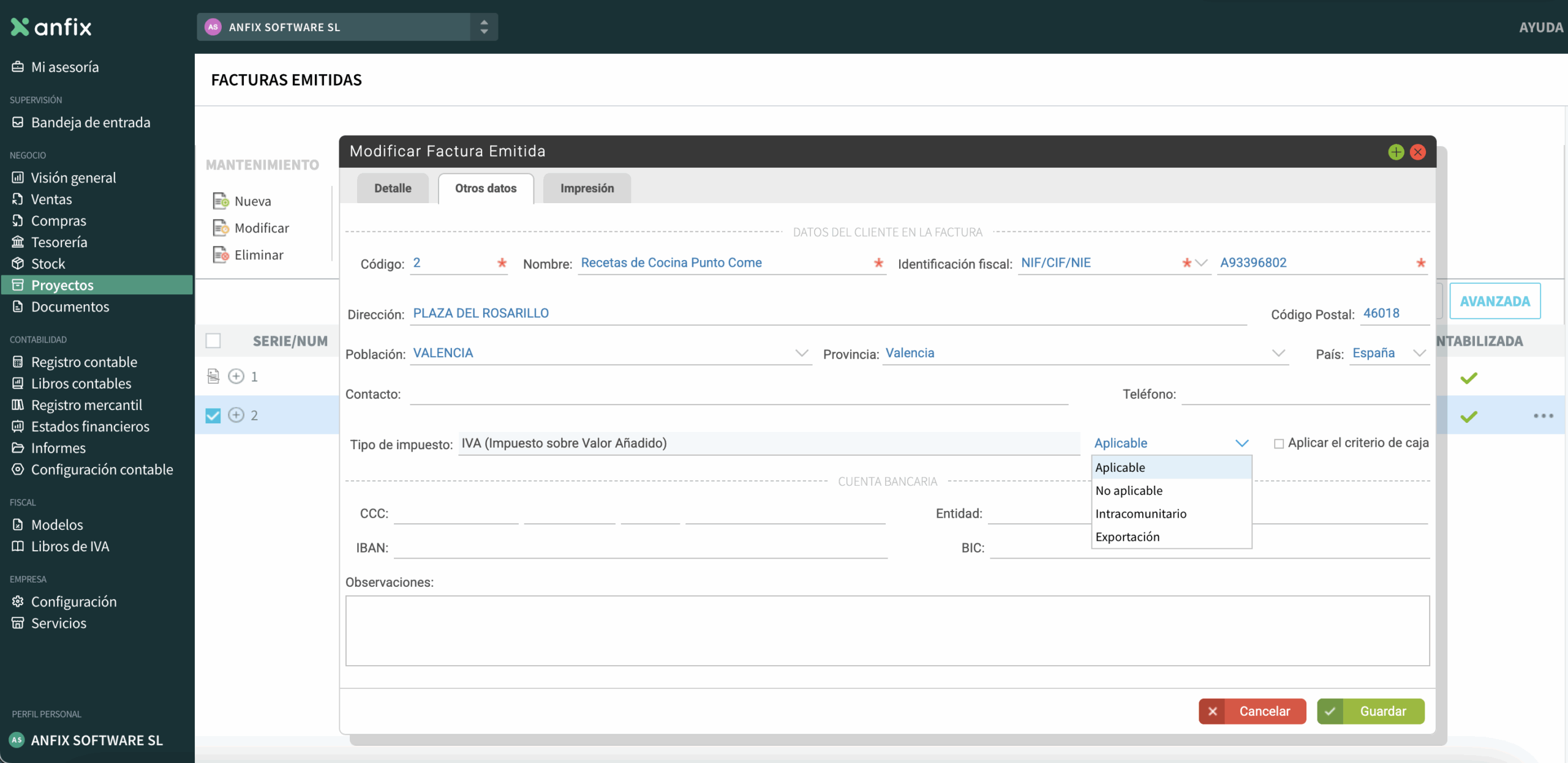 • Tipo de impuesto: IVA o IGIC, y si es «Aplicable», «No aplicable», «Intracomunitario», o «Exportación».