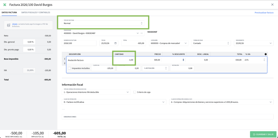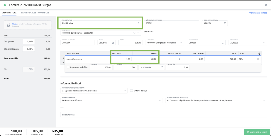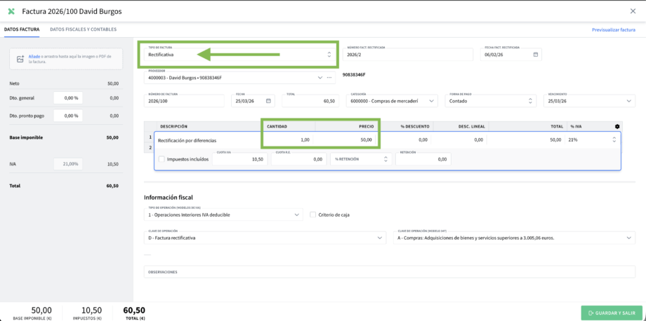 Si el importe de la rectificación es negativo, debes introducirlo con cantidad negativa.