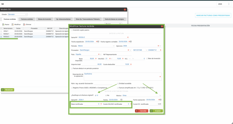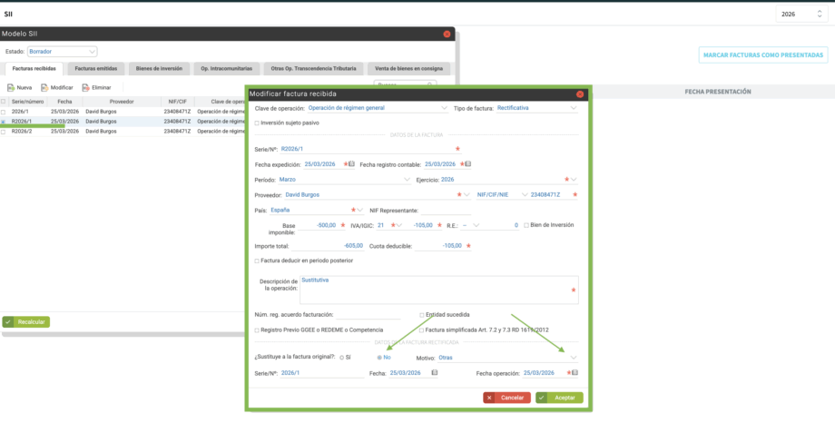 Si tu empresa está acogida al SII y registras una factura rectificativa por sustitución, al introducir la factura rectificativa debes: