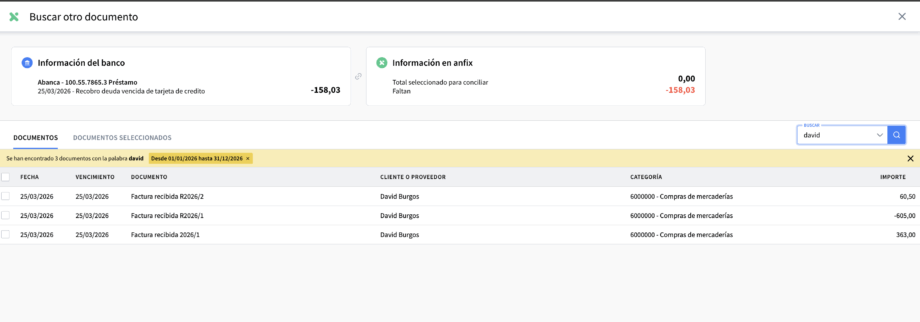 Podrás conciliarlos con un único movimiento bancario desde la función «Buscar otro documento». De esta forma, los tres documentos quedarán como pagados.