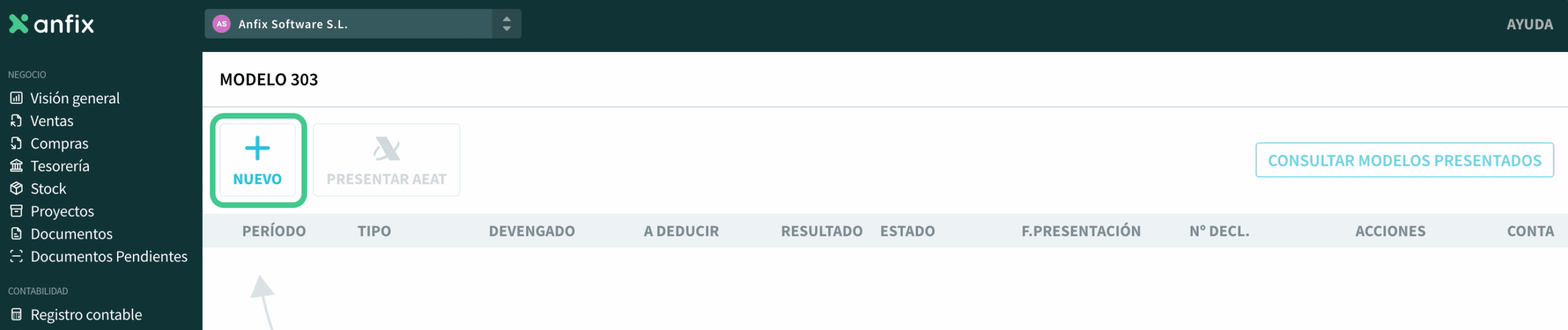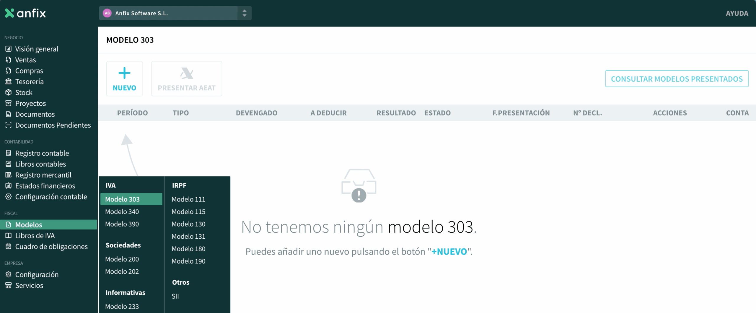 - Entra en Fiscal > Modelos y accede al modelo correspondiente. Vamos a ver el ejemplo del Modelo 303.