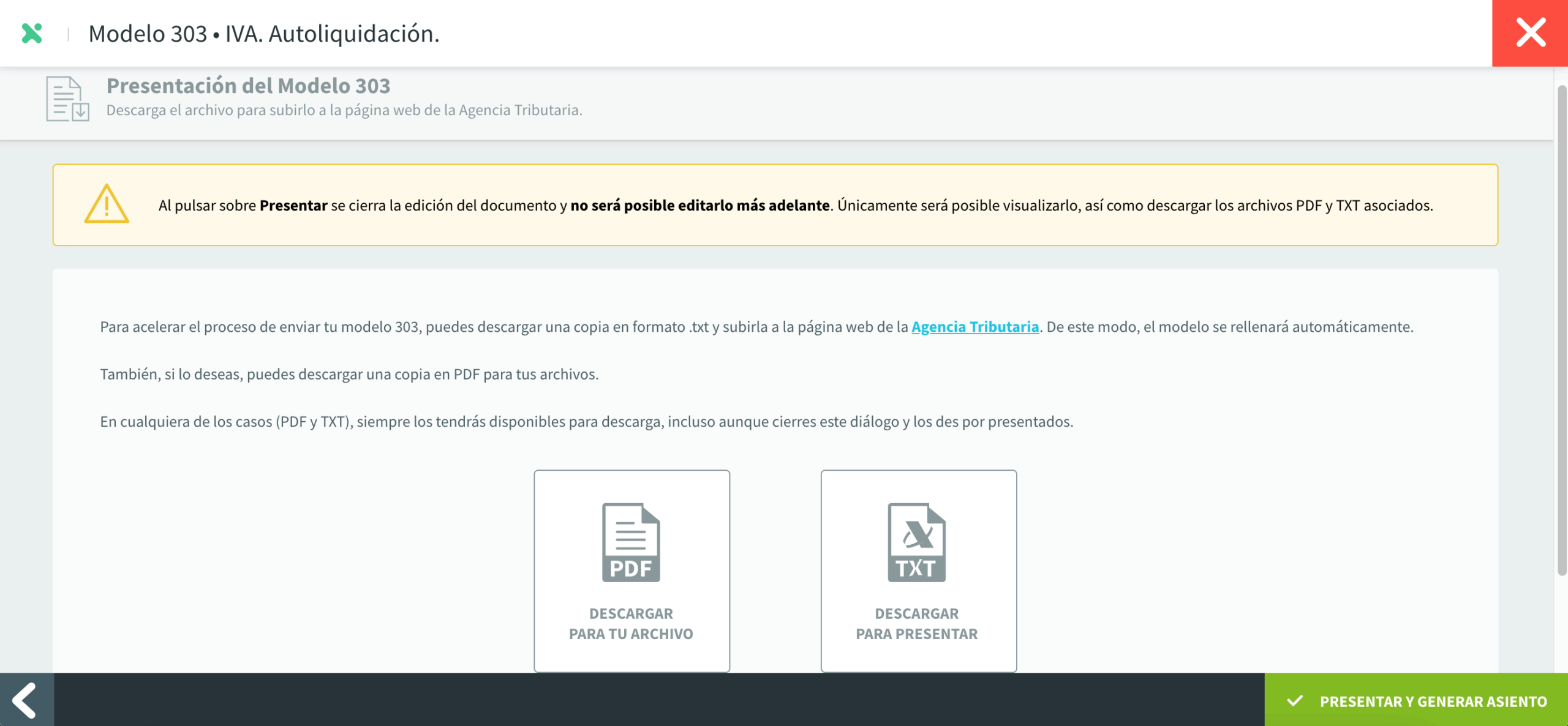 - En la última pantalla, haz clic en Presentar y generar asiento. El asiento se generará automáticamente.